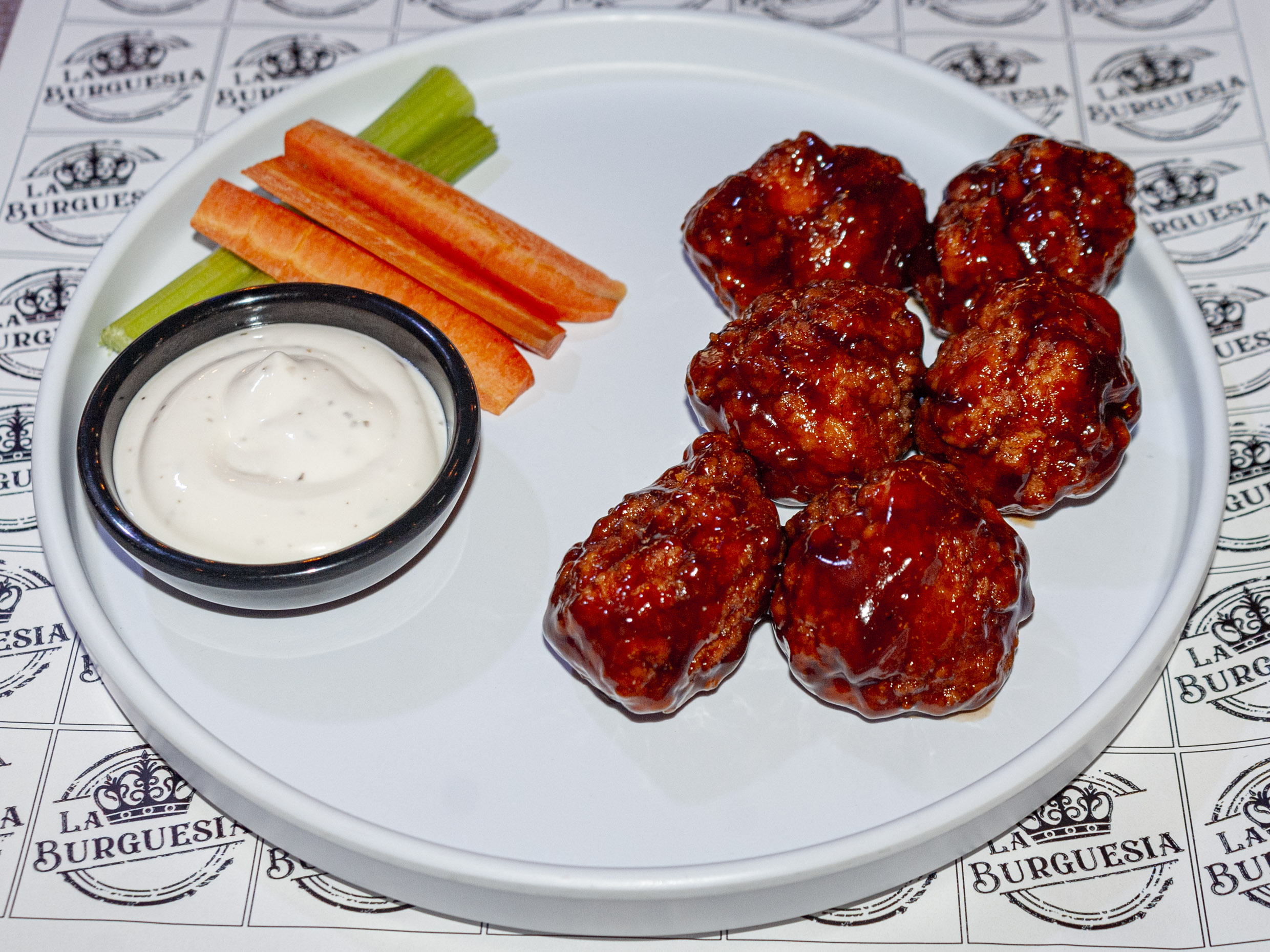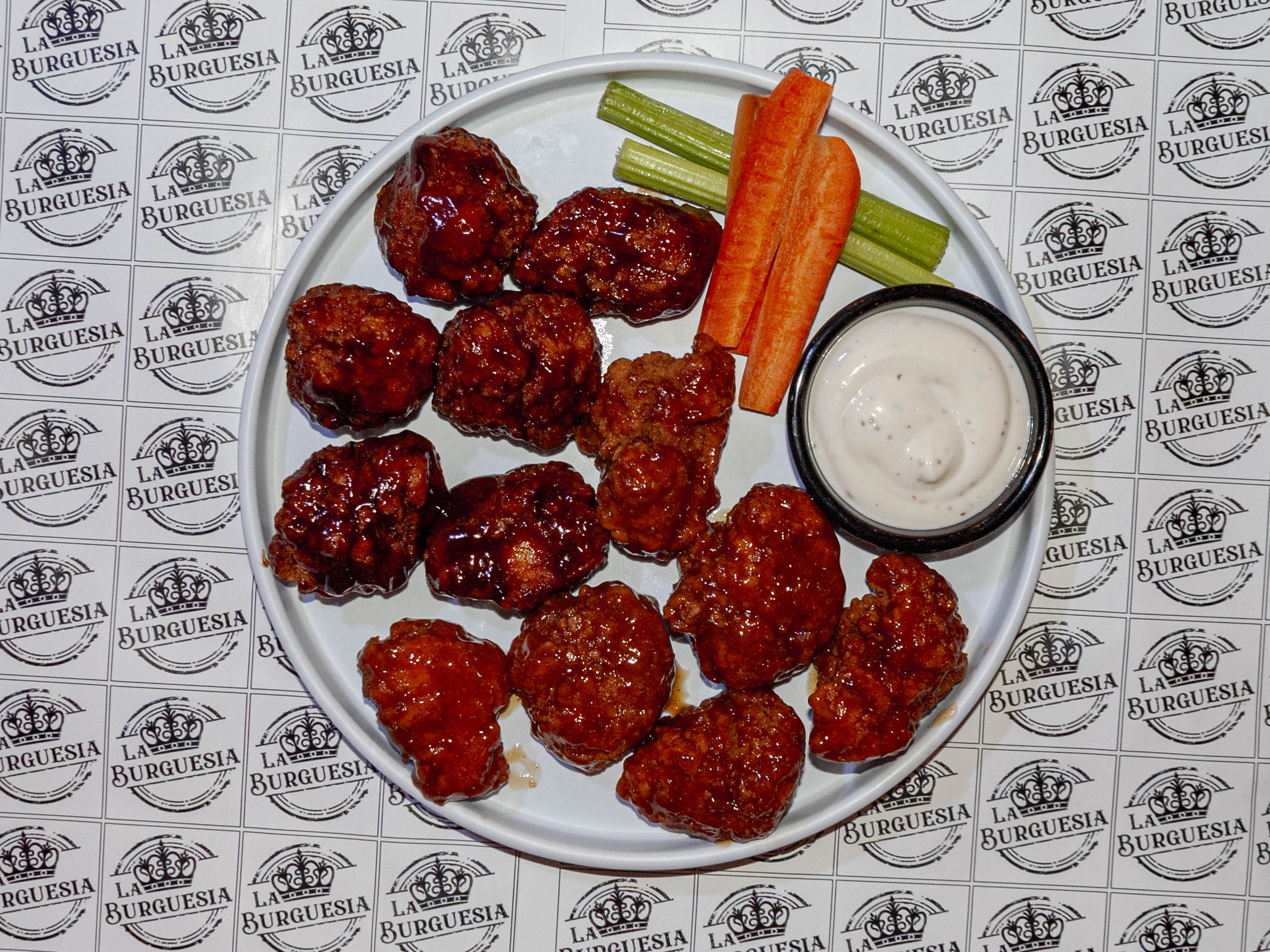Sabor a elegir: BBQ, BBQ picante, mango habanero, búfalo, lemon pepper, valentina negra o ajo parmesano. Aderezo a elegir: ranch o blue cheese.