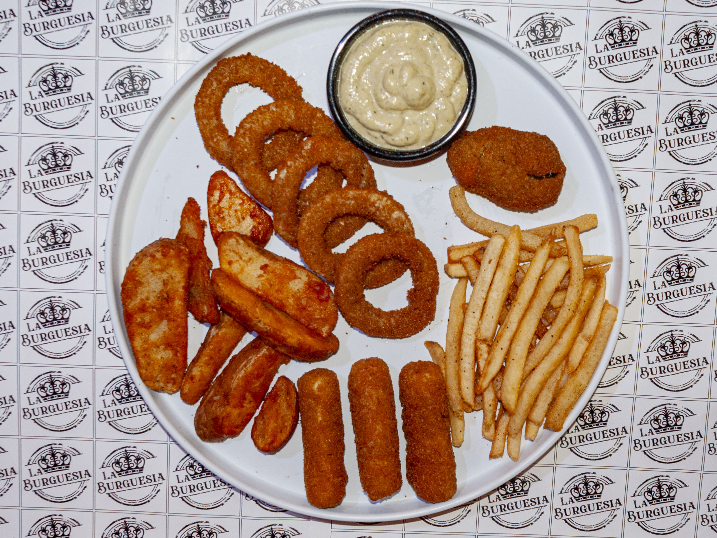 Deliciosa mezcla de nuestros snacks, 80 g de papas a la francesa, 5 aros de cebolla, 100 g de papas gajo, 3 dedos de queso y 1 jalapeño popper.