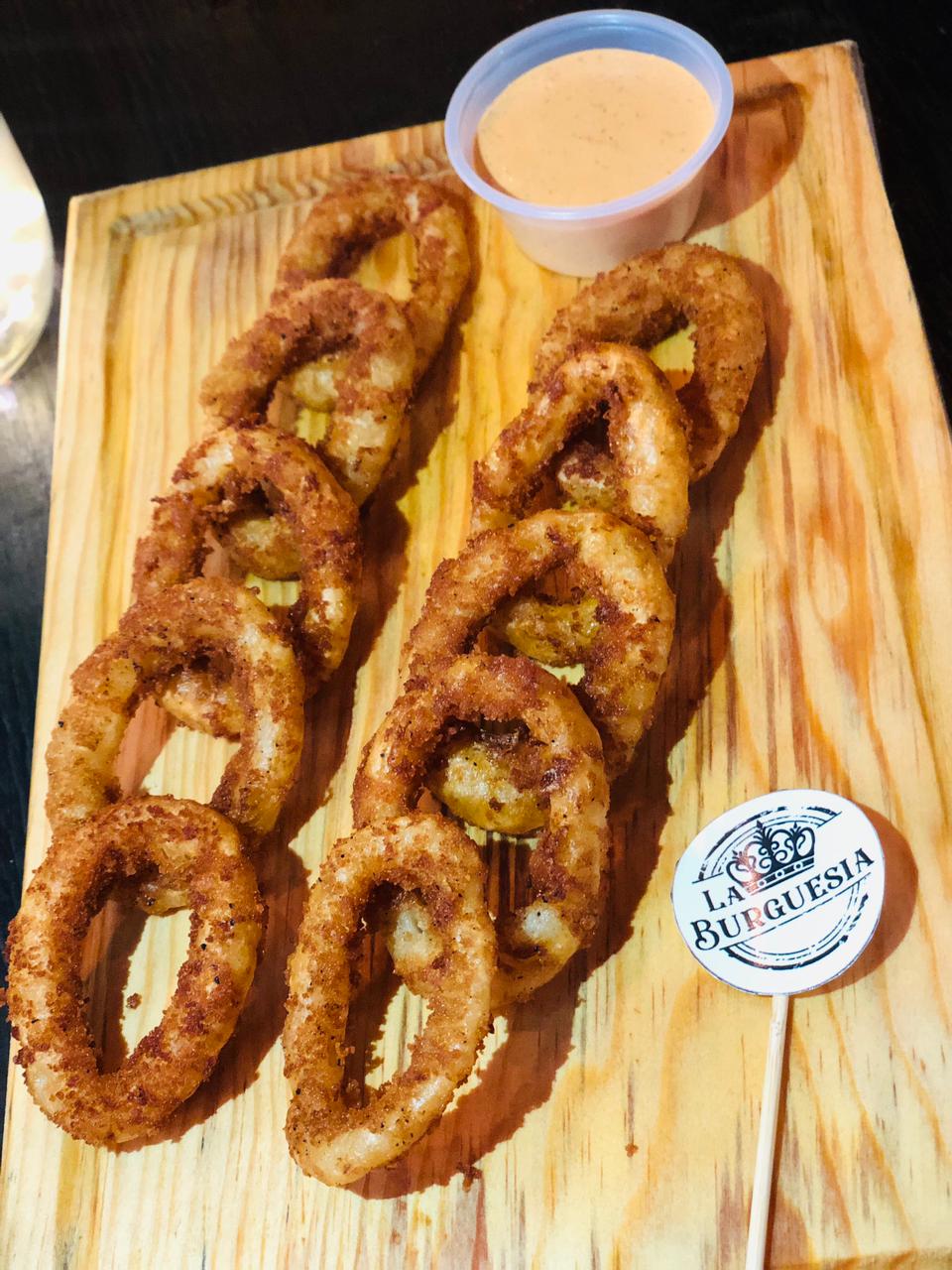 10 Piezas de crujientes aros de cebolla acompañados de aderezos de tu elección: chipotle o salsa tártara.