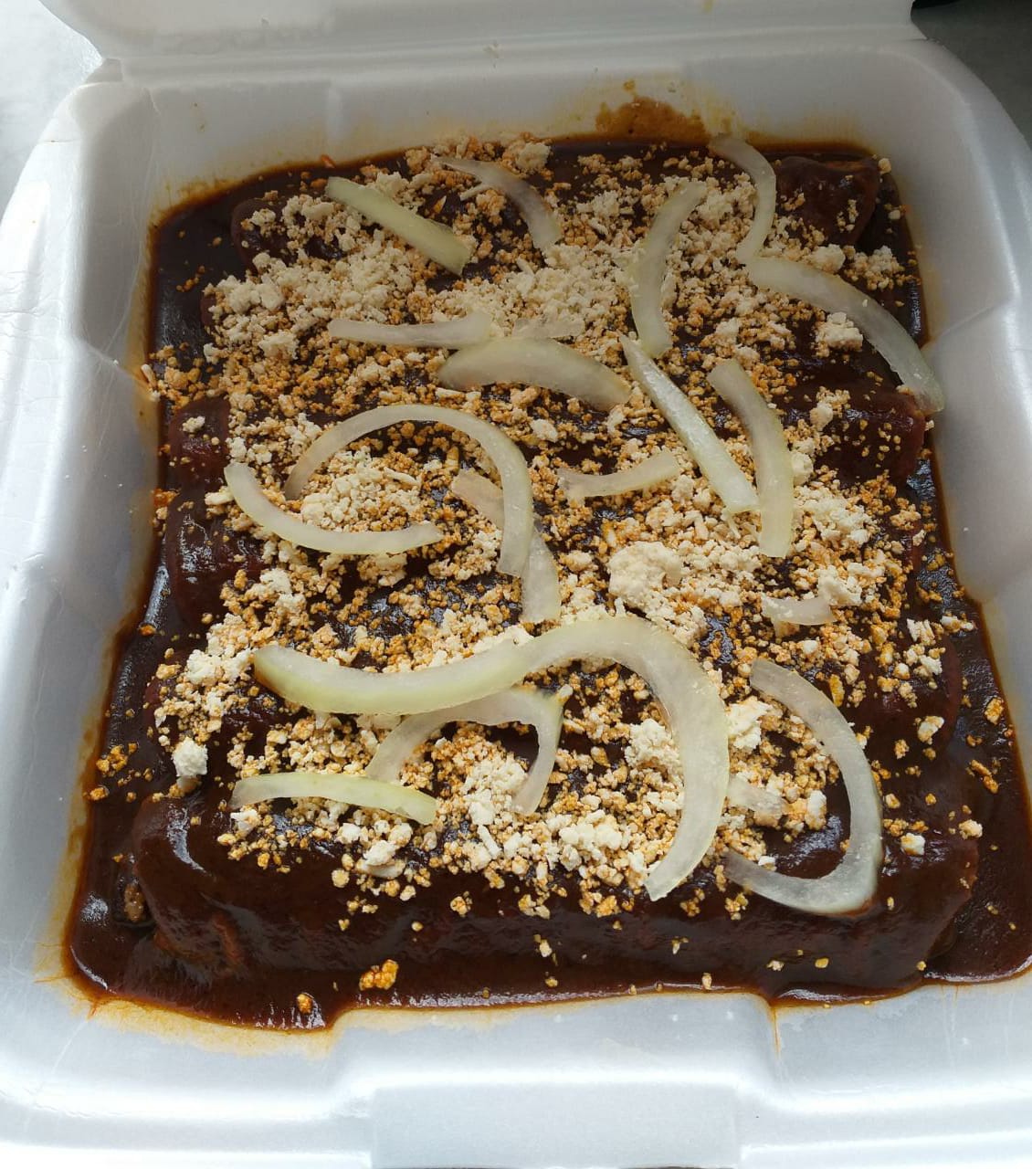6 Deliciosas enchiladas rellenas de carne molida de res, bañadas con rico mole 100% casero, queso y cebolla.