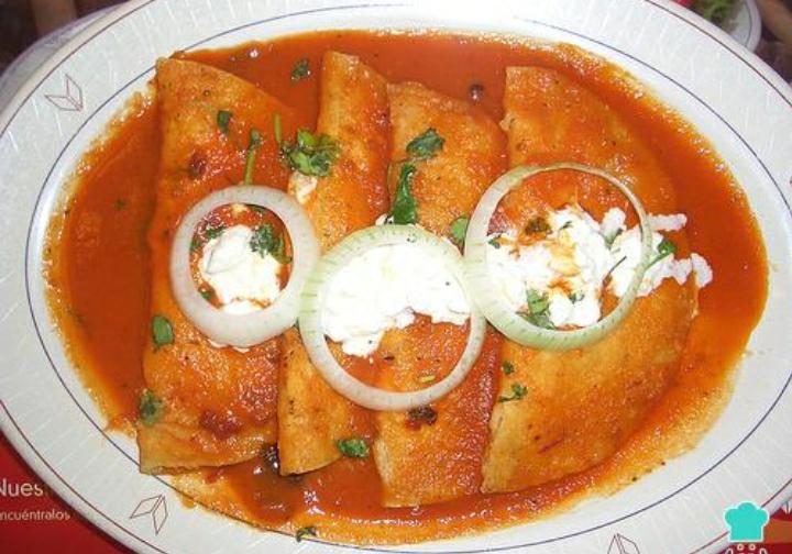 4 Tortillas rellenas de pollo y bañadas en salsa roja, crema y queso, acompañadas de frijoles y platanitos fritos.