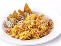 2 Huevos revueltos con Jamón, acompañados con frijoles y plátanos fritos.