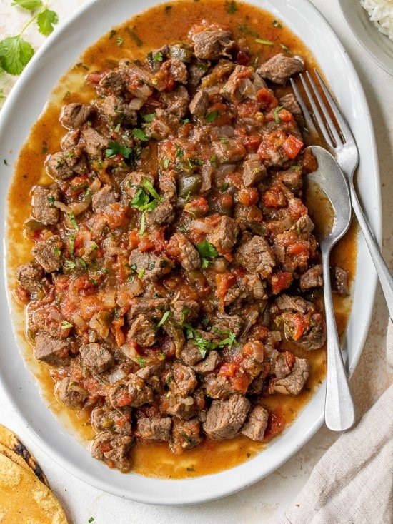 Deliciosos bisteces a la mexicana, acompañados de frijoles y plátanos fritos.