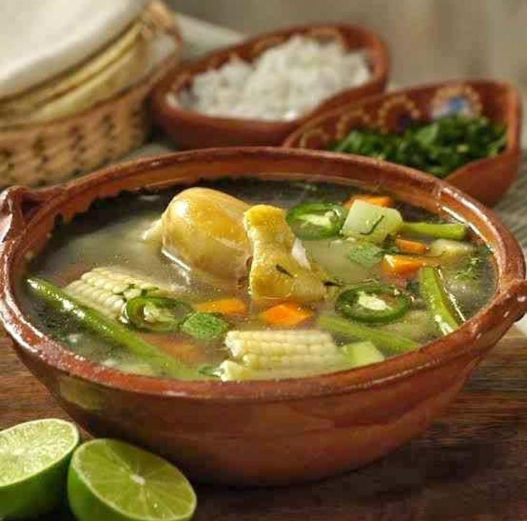 Caldo gallina con macarrón, papa acompañado de tortilla, limón, cebolla morada con cilantro y chile habanero
