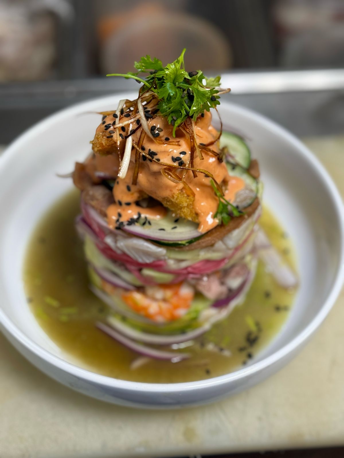Camarón cocido, camarón curtido, pulpo pescado, atún, cebolla morada, aguacate terminado con camarón roxa y salsa de tu eleccion (roja, verde, chea o negra.