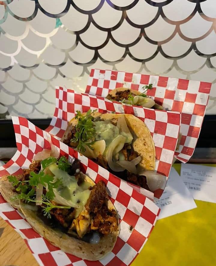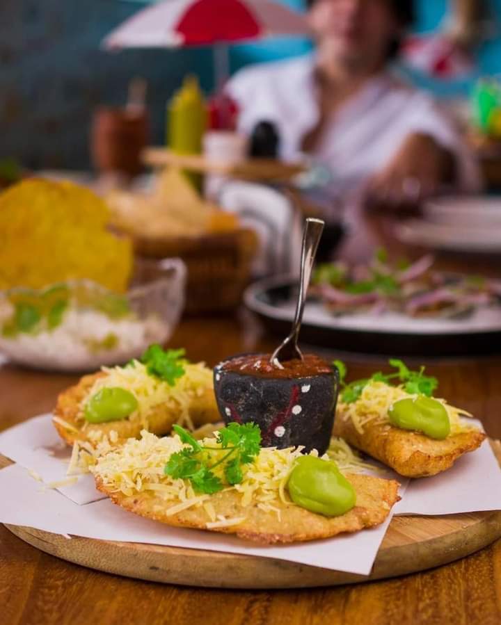 Acompañados con limón, pepino, cebolla morada, aguacate, poro frito, cilantro criollo, y chile tatemado, verde/rojo/negro/la chela (salsa secreta).