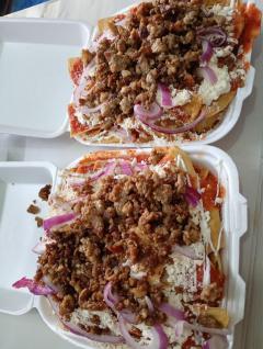 (Una orden) totopos bañados con salsa roja, arrachera, media crema, queso y cebolla.