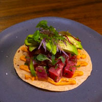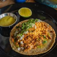 Nuestro taco con carnitas tradicional de atun, con cebolla y cilantro.