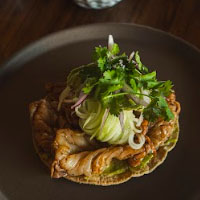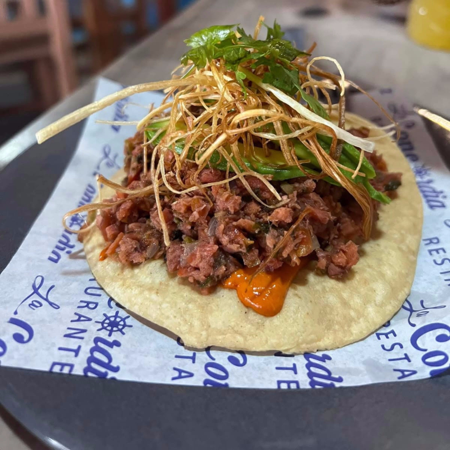 Crujiente tostada con sabroso marlín ahumado, fresco y lleno de sabor.
