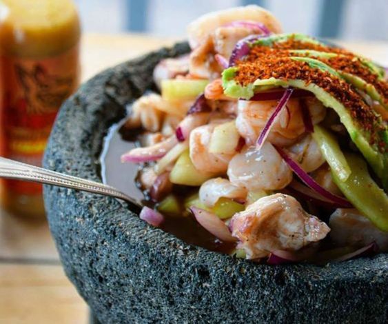 Camarones marinados en limón, mezclados con tomate, cebolla, cilantro y un toque de chile