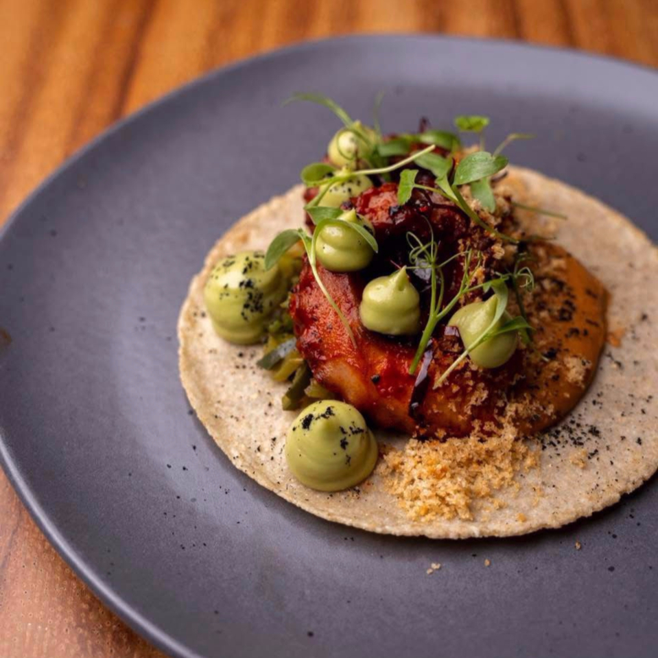 Pulpo tierno cocinado al ajillo, Tortilla de maiz elaborada a mano con una cama de frijol.
