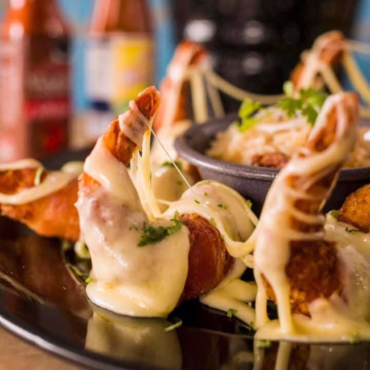 Deliciosos Camarones Rellenos de queso crema, envuelto en tocino cubiertos de queso fundido.