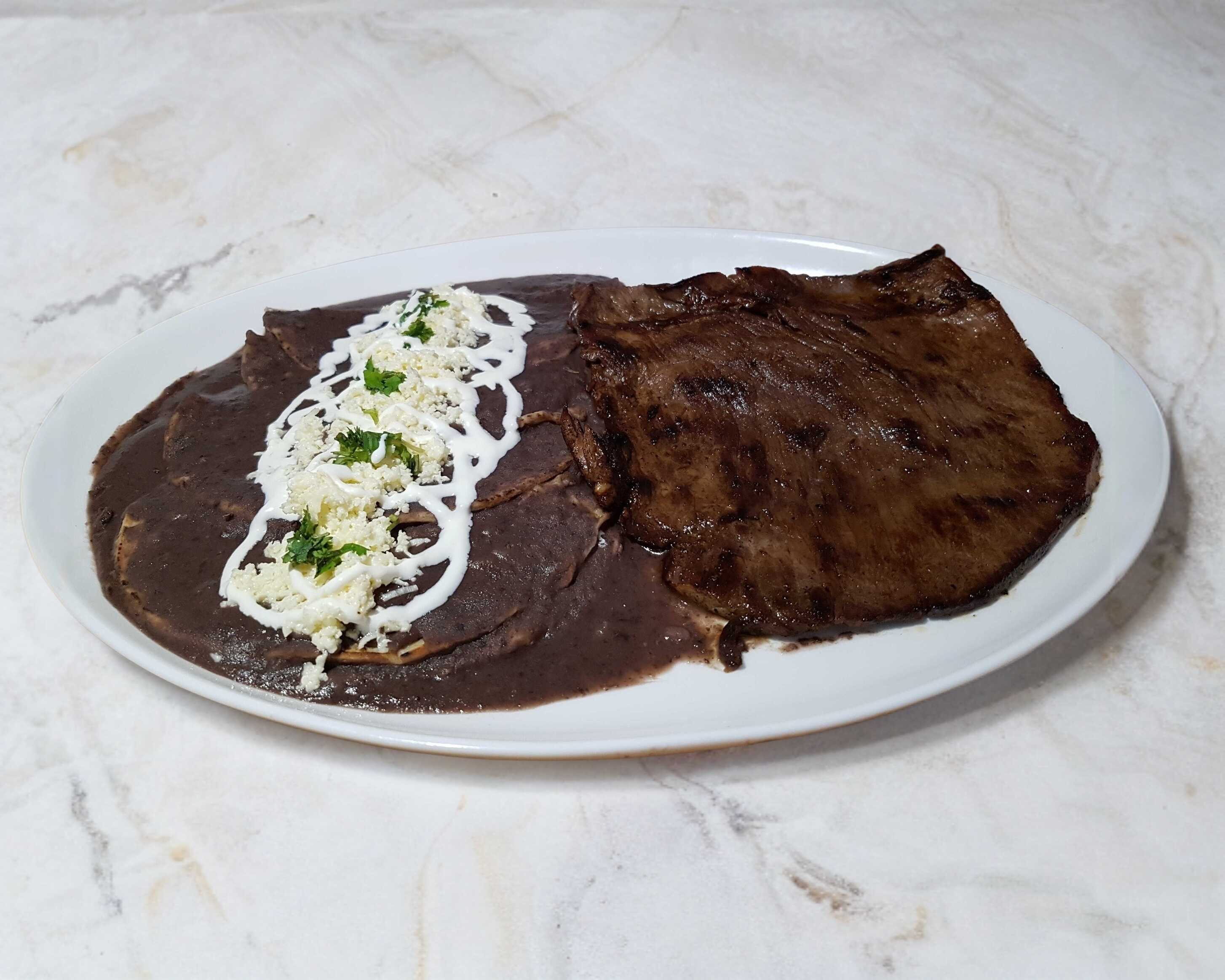 4 Tortillas de maiz con salsa de frijoles bañadas con crema y queso. Acompañadas 200gr de cecina