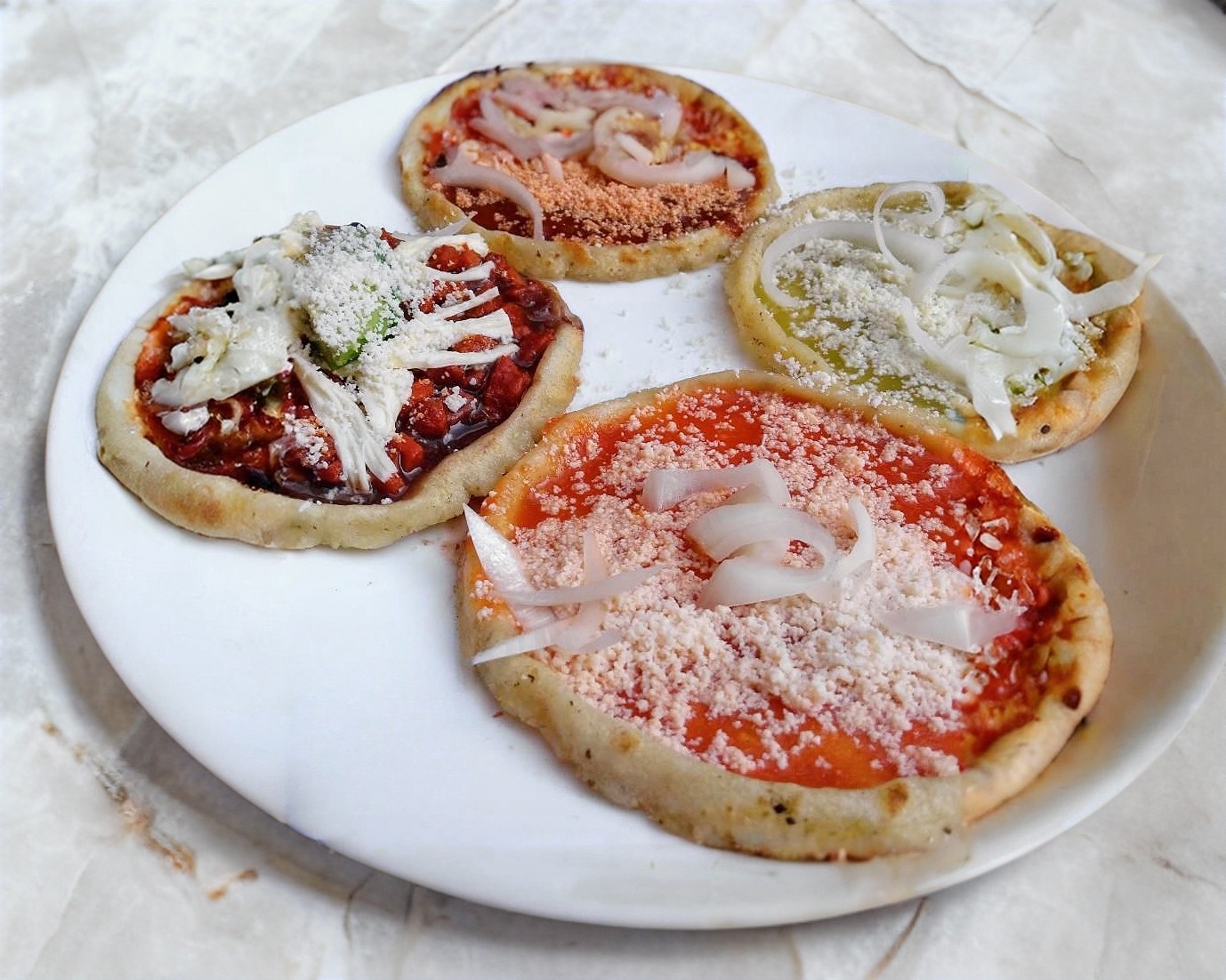 3 Tortillas gruesa de masa de maiz hecha a mano, pellizcada de los bordes cubierta con la salsa de su preferencia roja o verde,cebolla y queso