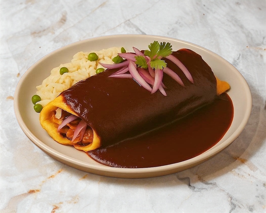 Omelett relleno de chilaquiles con mole y bañados en su salsa y un toque de cilantro y cebolla morada filetiada acompañado con arroz