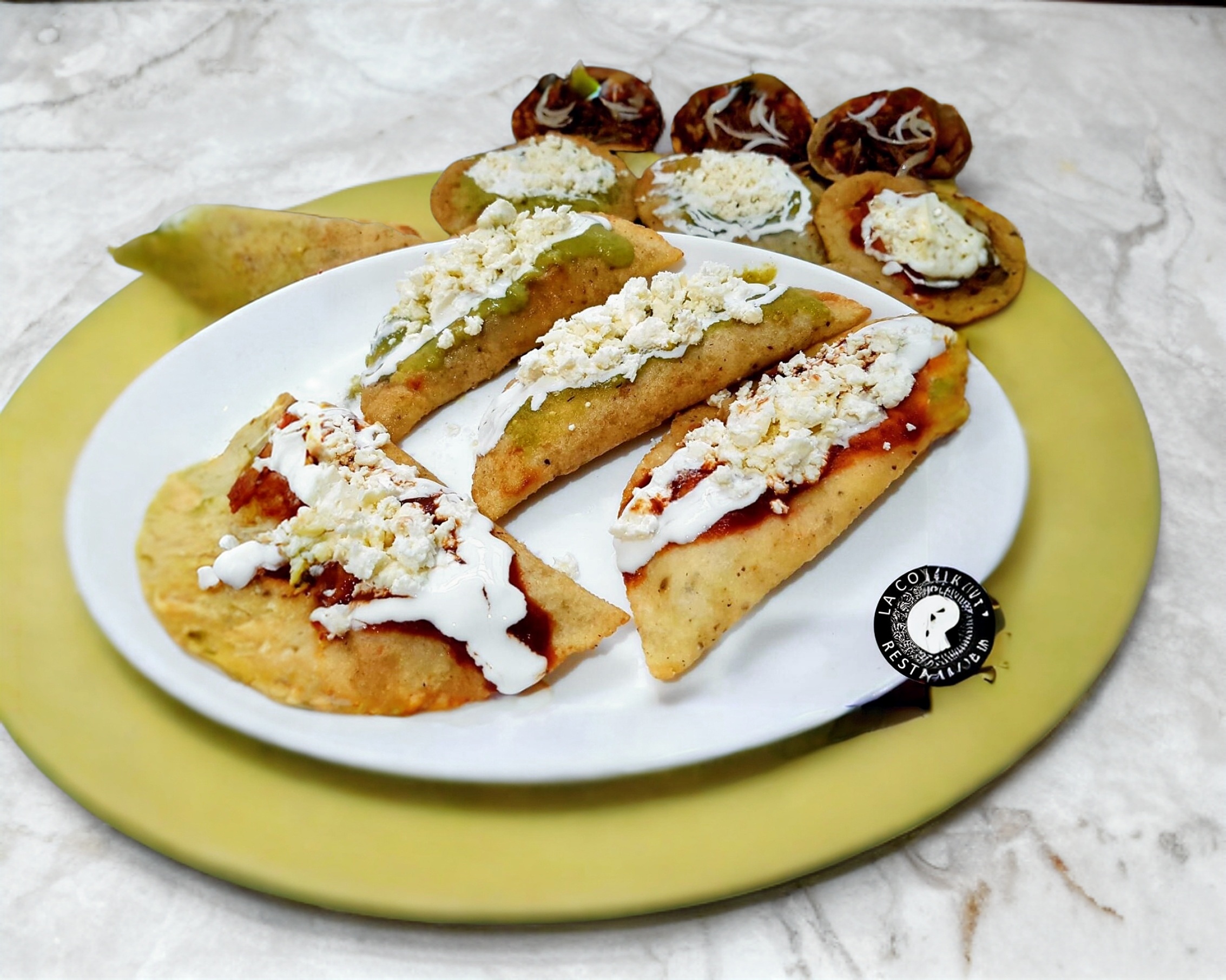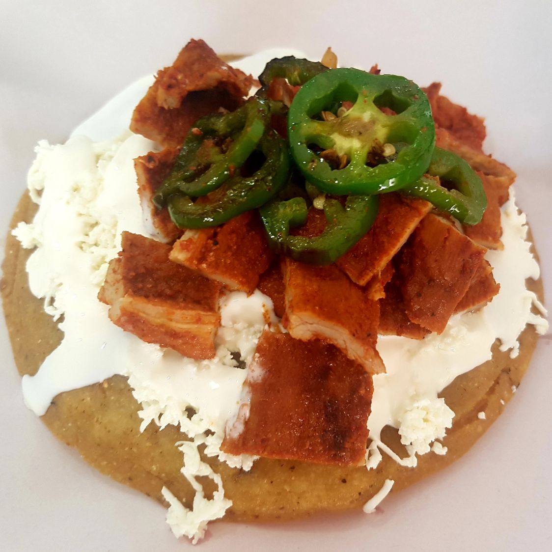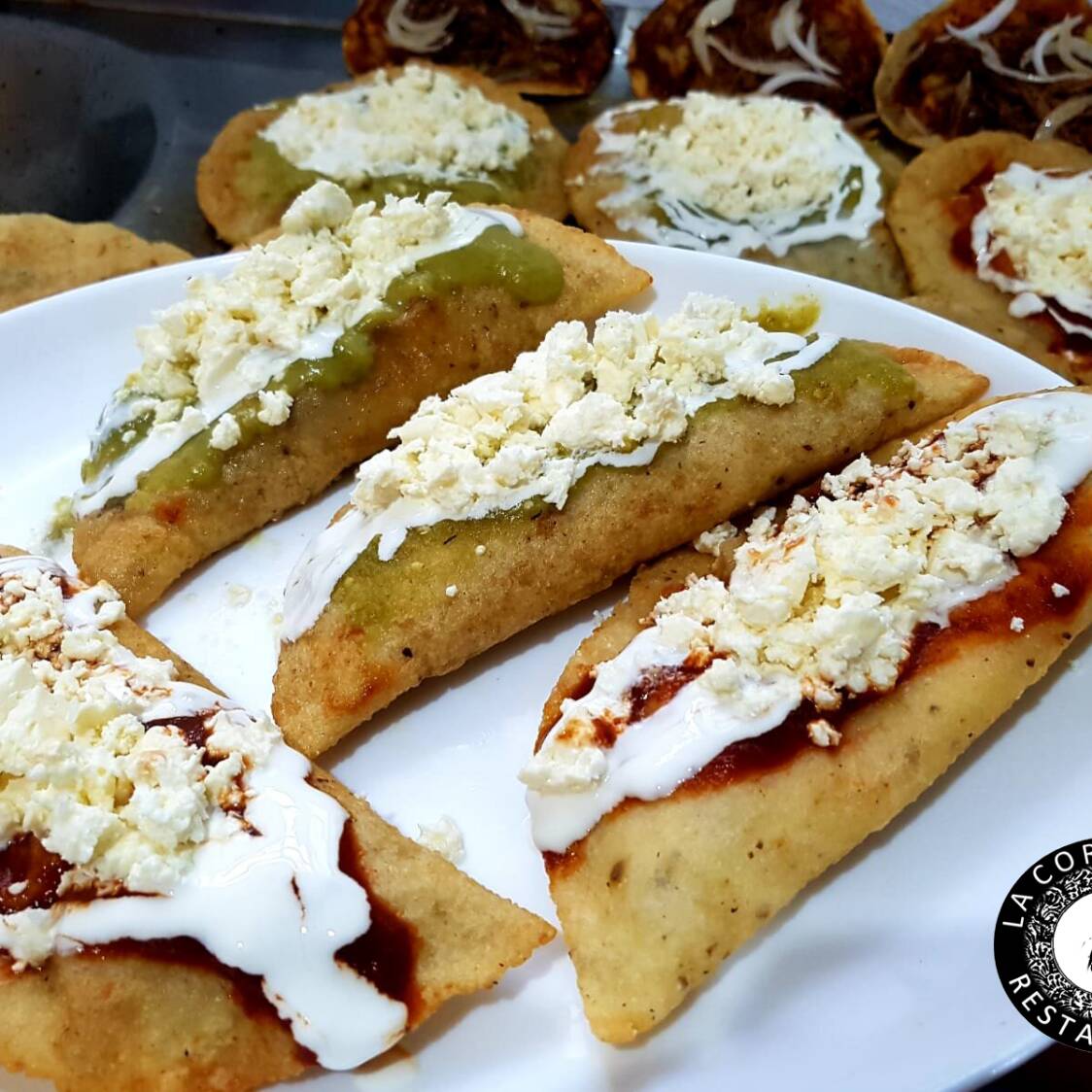 Tortilla echa a mano con masa de maiz frita, rellena de carne molida, queso, longaniza o pollo, cubierta de queso, crema y salsa