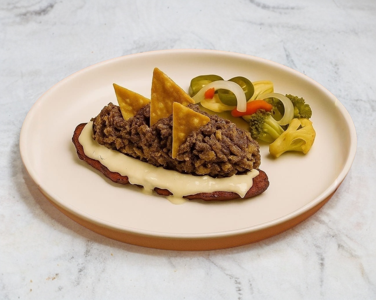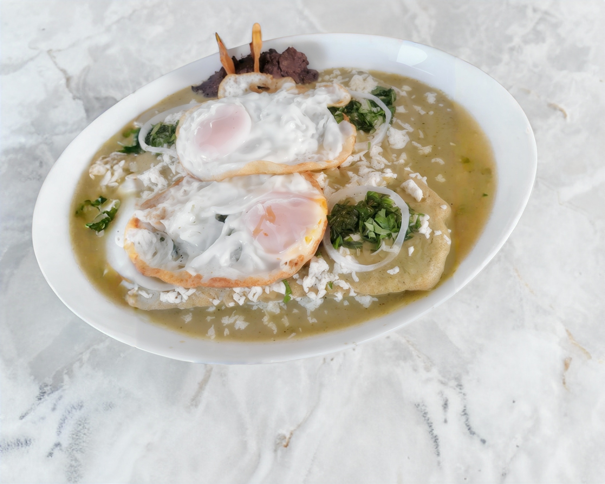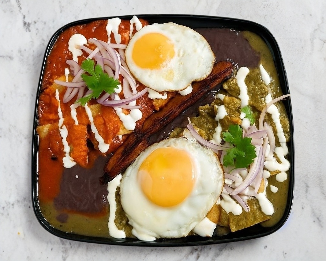 Huevos fritos servidos sobre tortillas crujientes bañados en salsa de tomate, y acompañados de chicharos ,plátanos fritos, y queso desmoronando. Se coronan con tiras de cebolla morada y un chile toreado