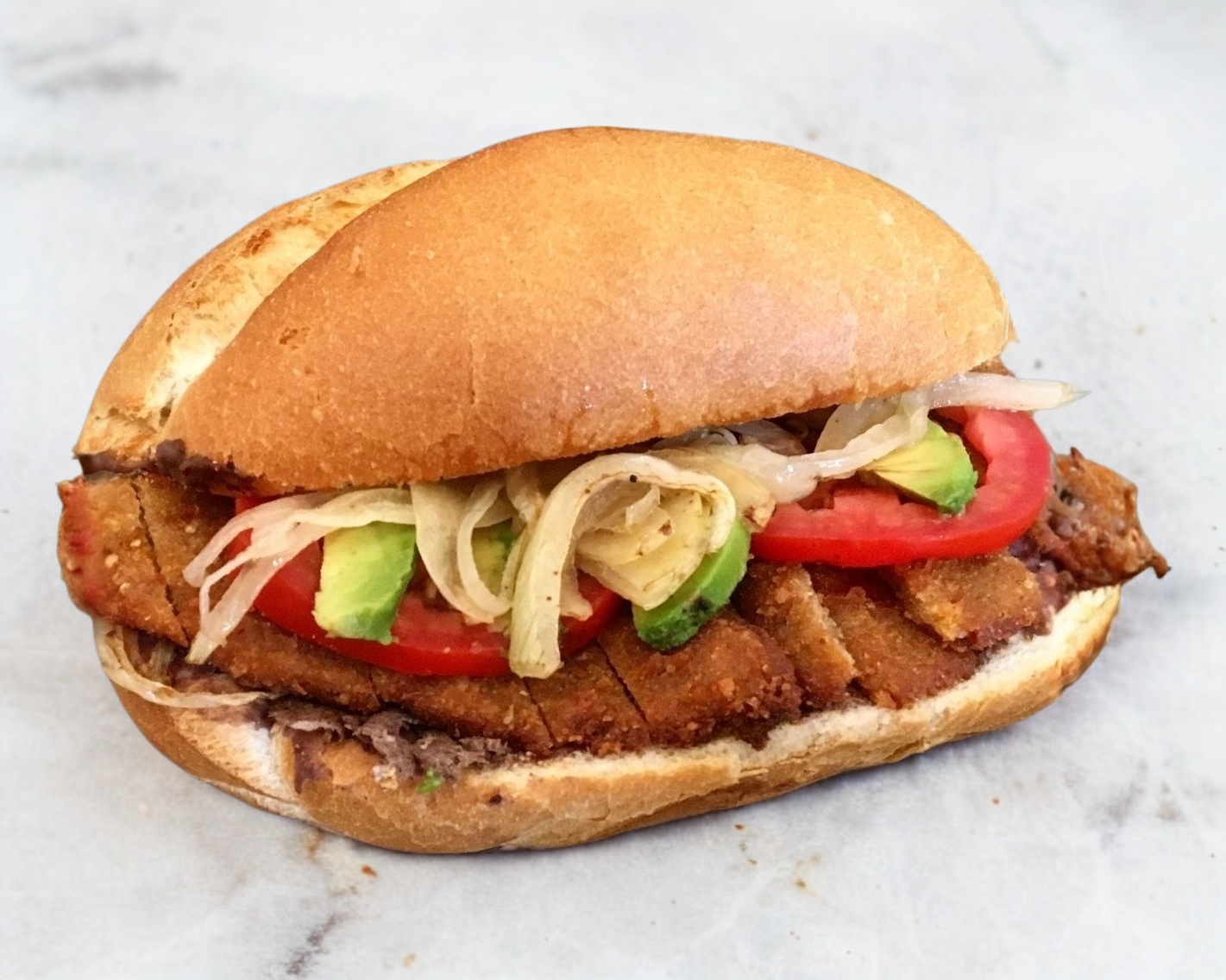 Bolillo con frijol, tasajo de milanesa de res, cebolla, jitomate, aguacate y mayonesa