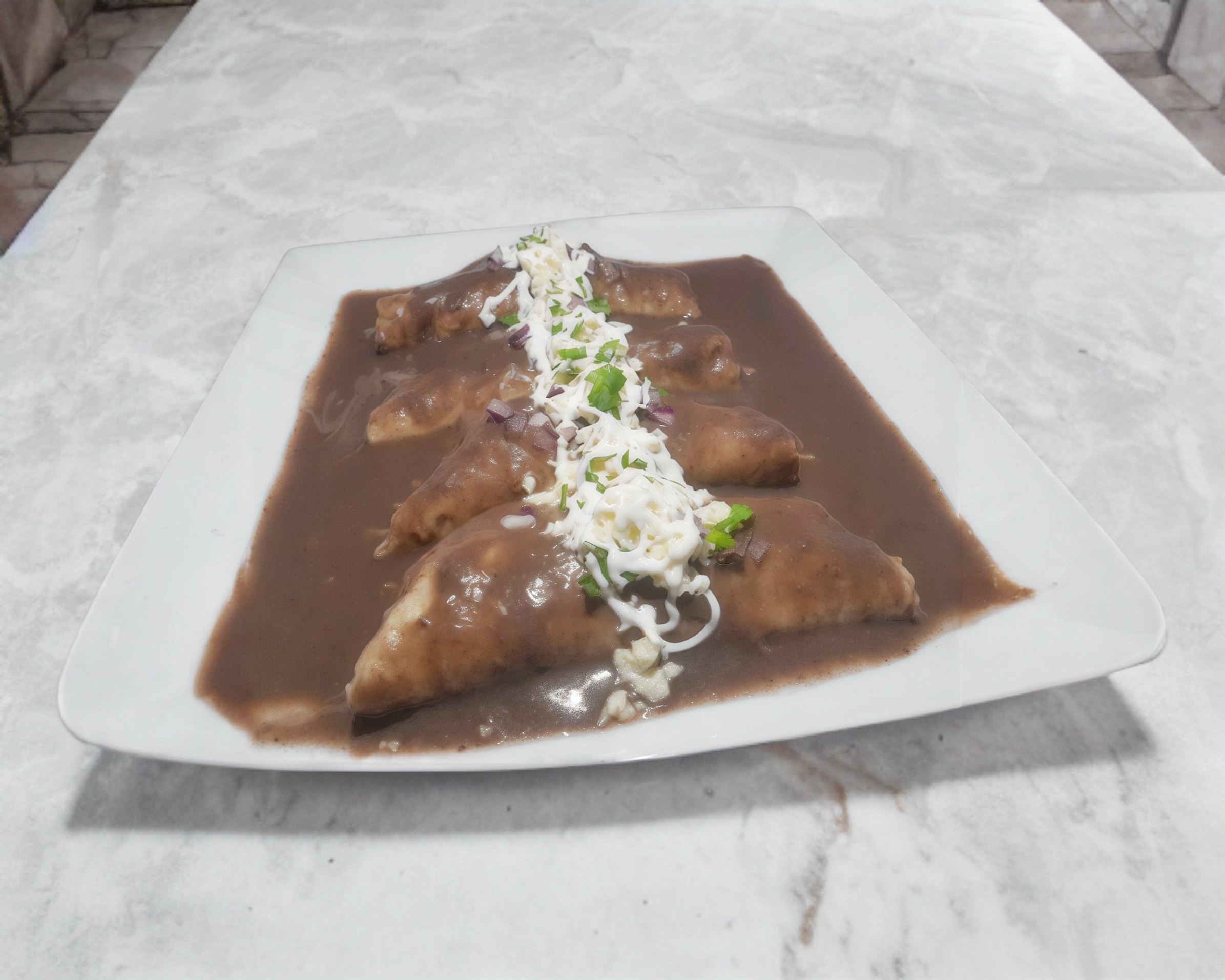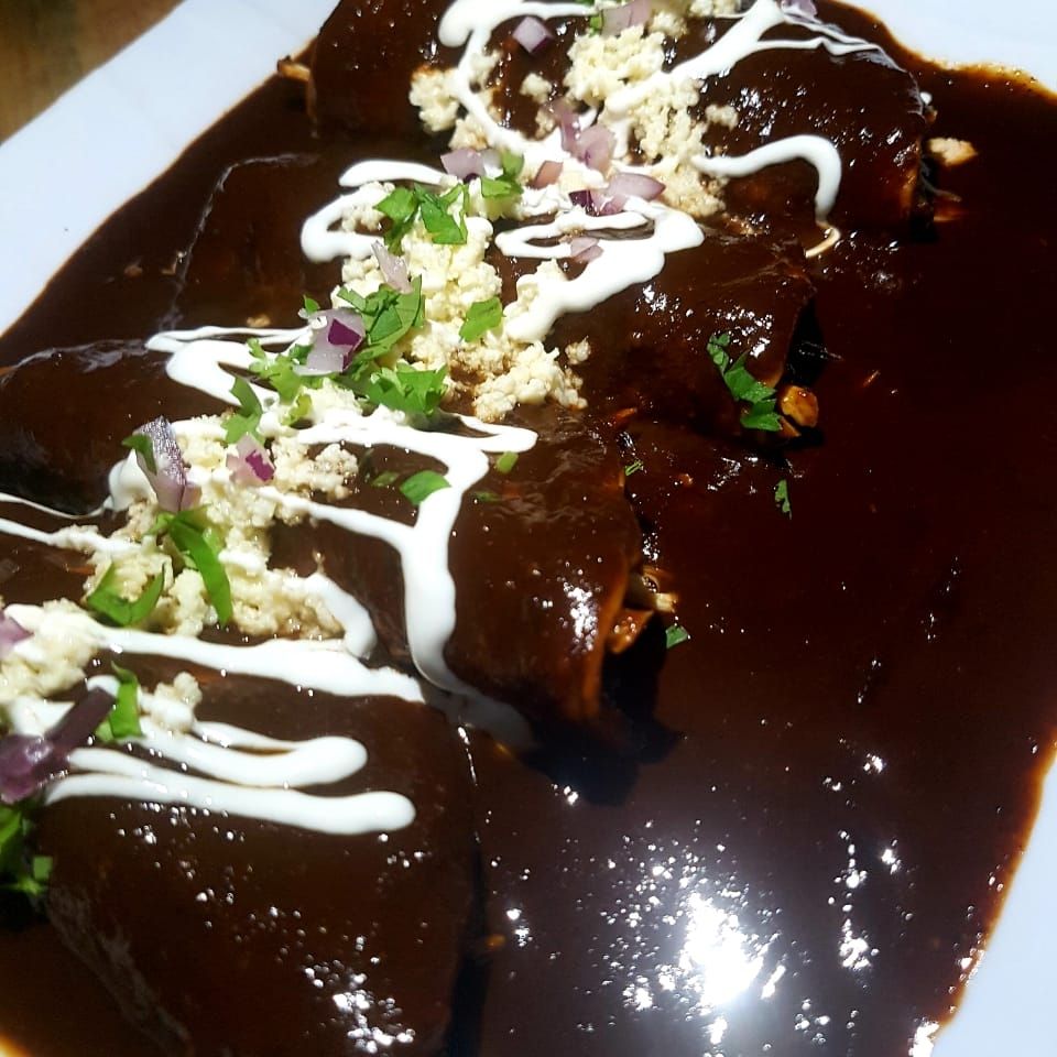 4 Tortillas de Maiz, Rellenas de pollo cubiertas con mole, crema, cebolla, queso