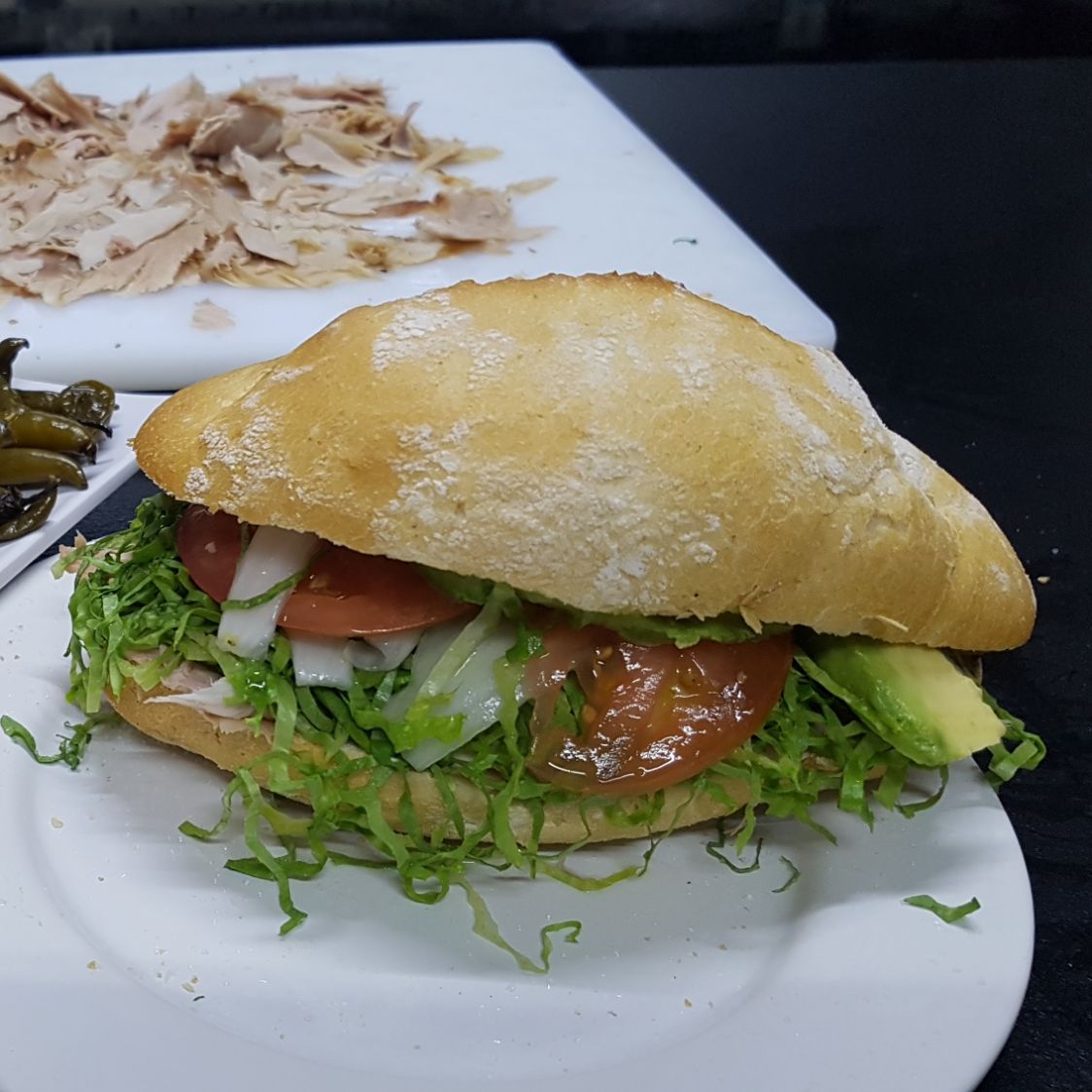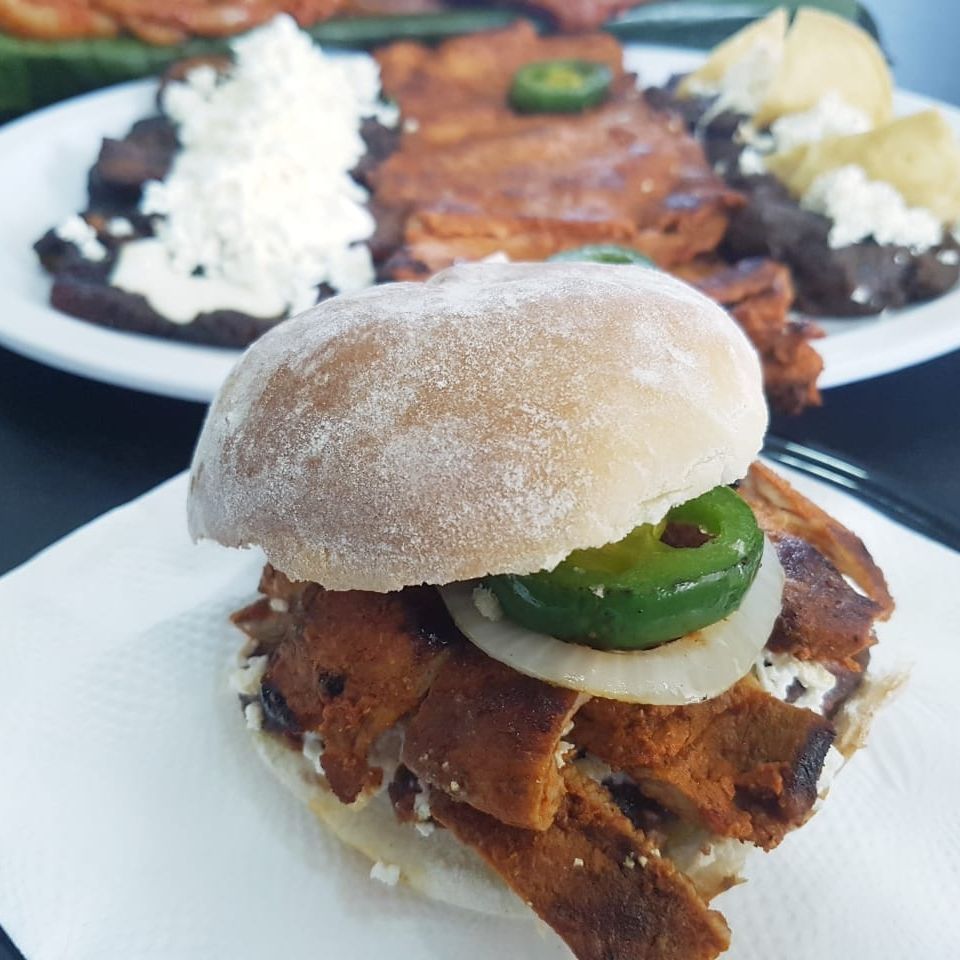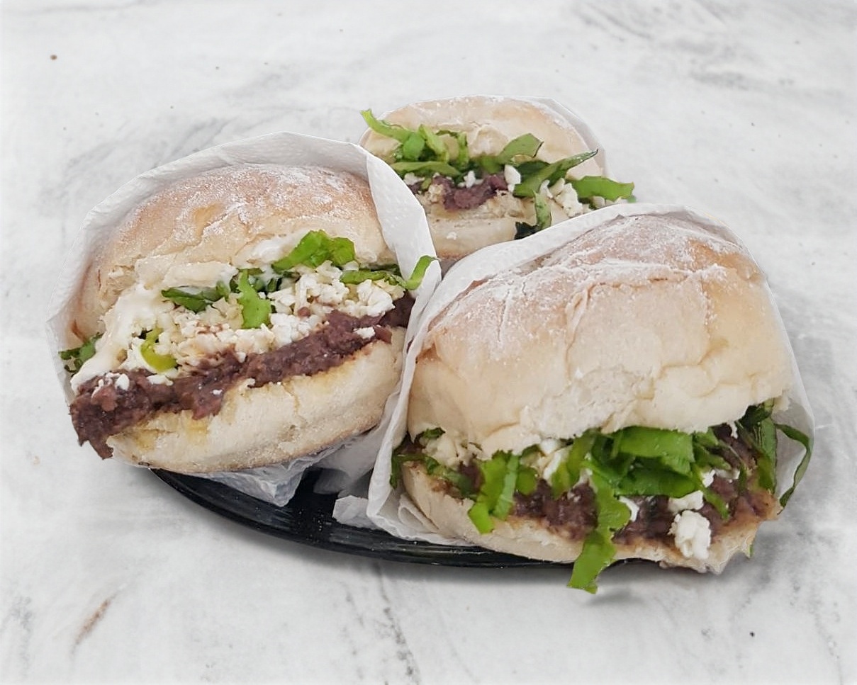 Bolillo tradicional, frijoles,Pierna horneada,lechuga,tomate,aguacate,cebolla fileteada,mayonesa+ Salsa a elegir, Salsa picada, Jalapeños en Escabeche,Chipotles en escabeche.