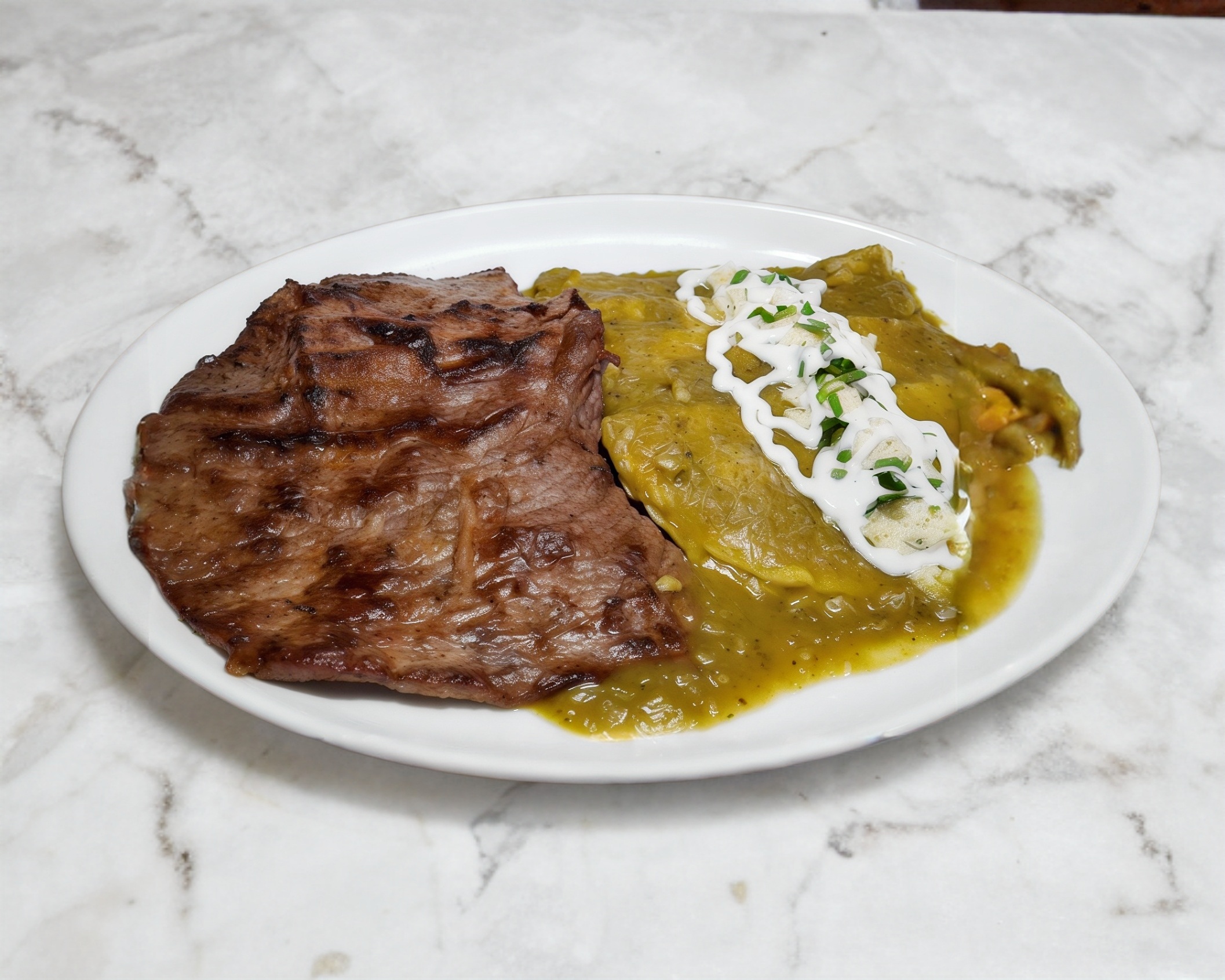 Enchiladas salsa a elegir verde o roja bañadas con crema y queso acompañadas con frijoles. No incluye carne