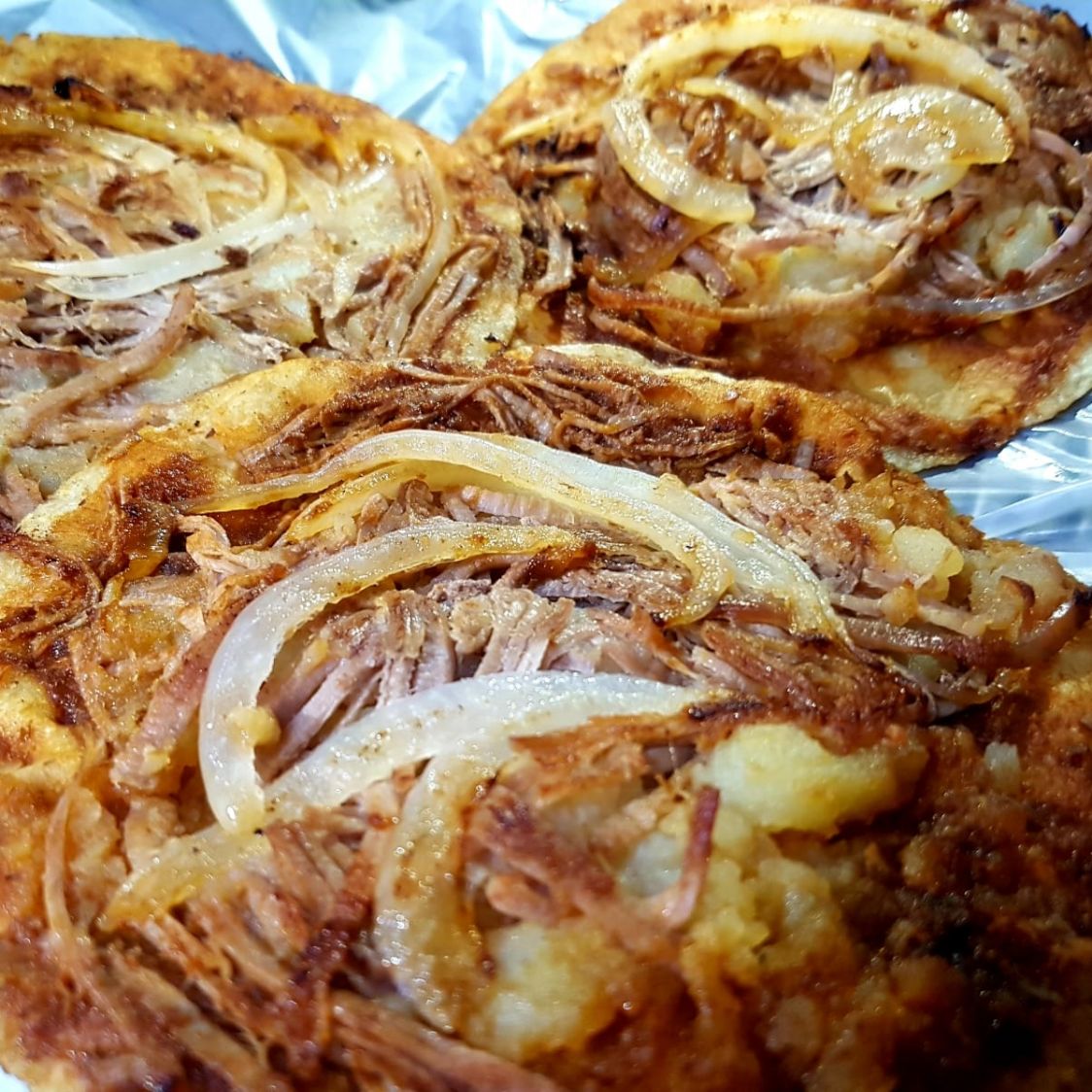 Tortilla de maiiz enchipotlada papa y carne deshebrada y cebolla fileteada