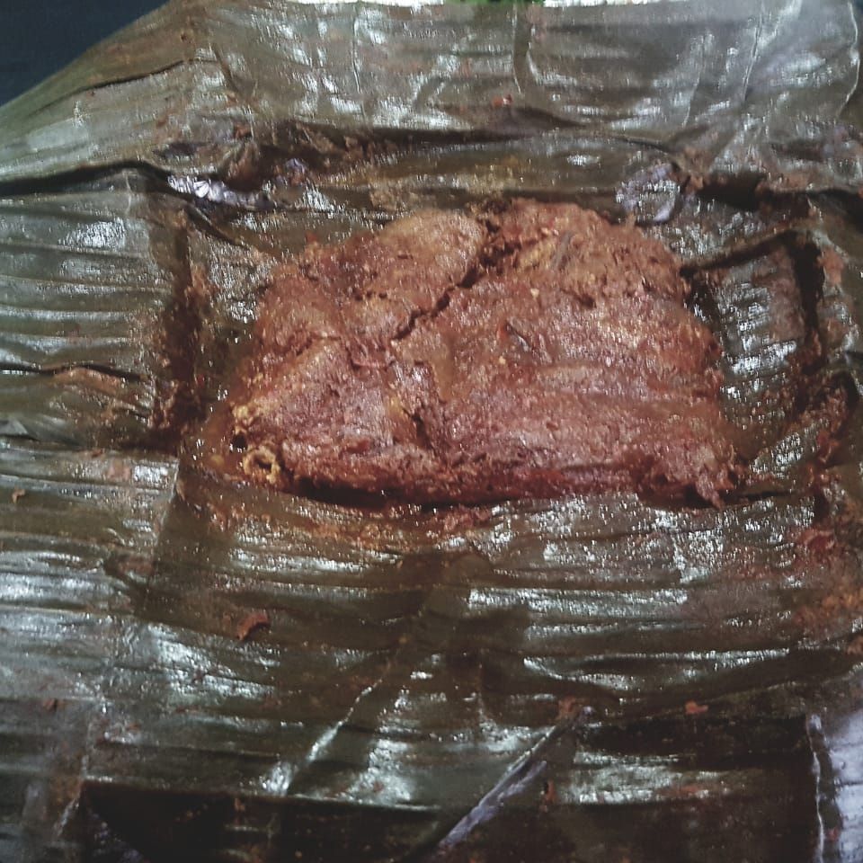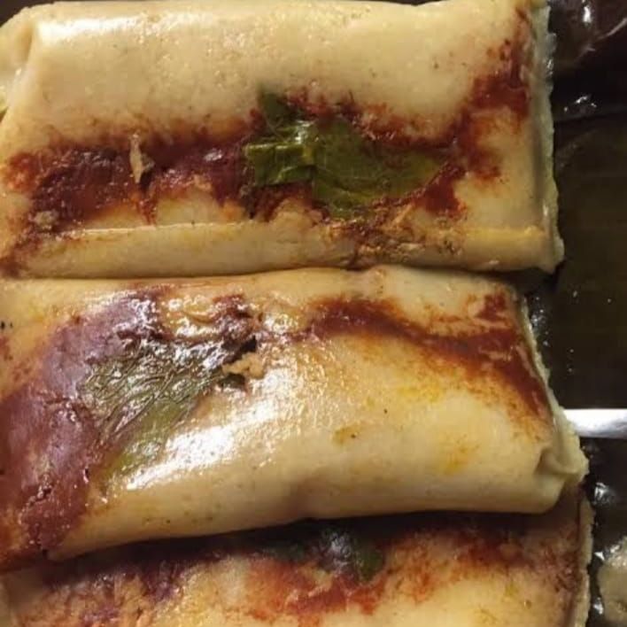Tamales de masa cocida envueltos enhoja de platano estilo veracruz ,rellenos con pollo adobado y un toque de hoja de momo.