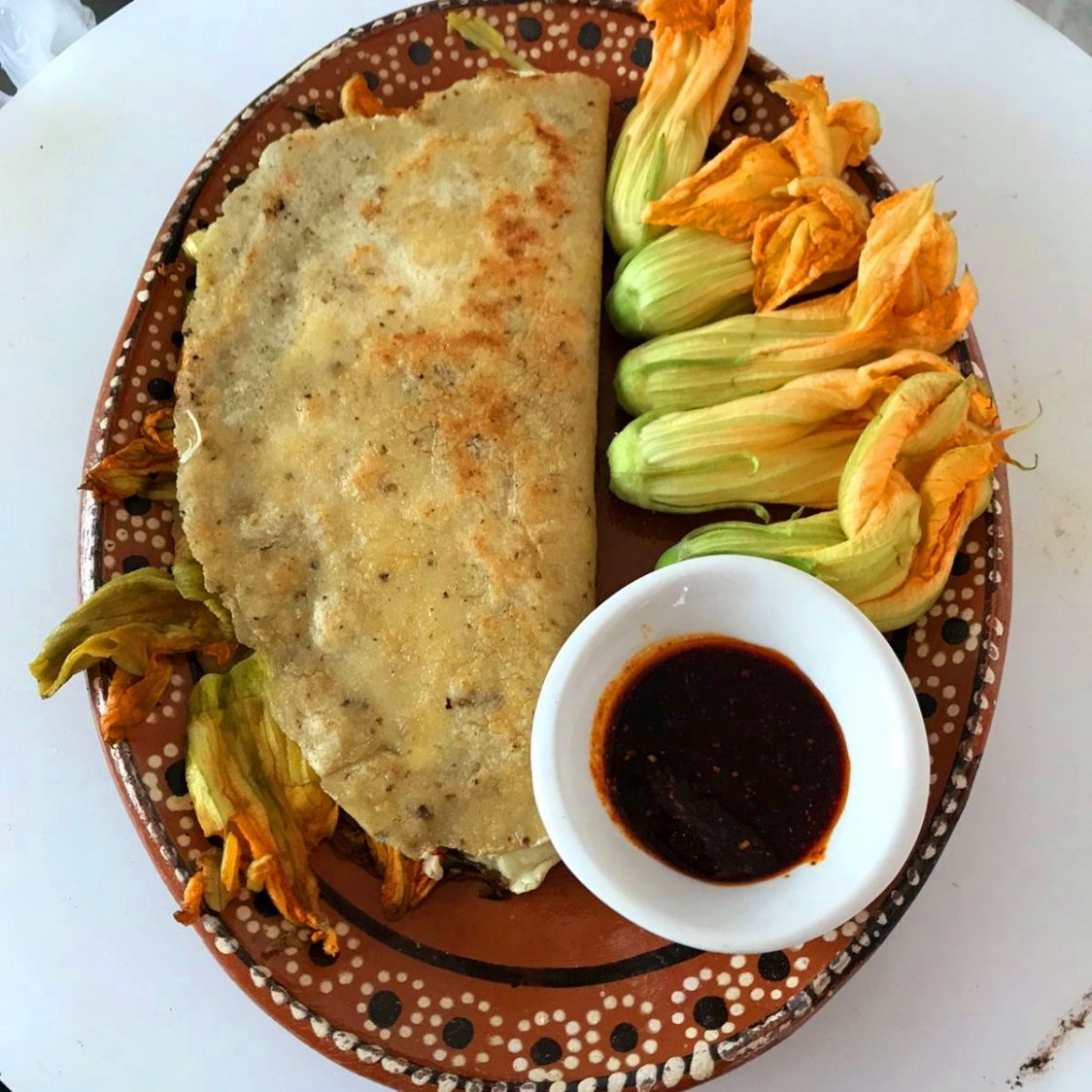 Quesadilla de masa de maiz hecha a mano, rellena de queso de hebra con flor de calabaza y un toque de epazote y chicharrón