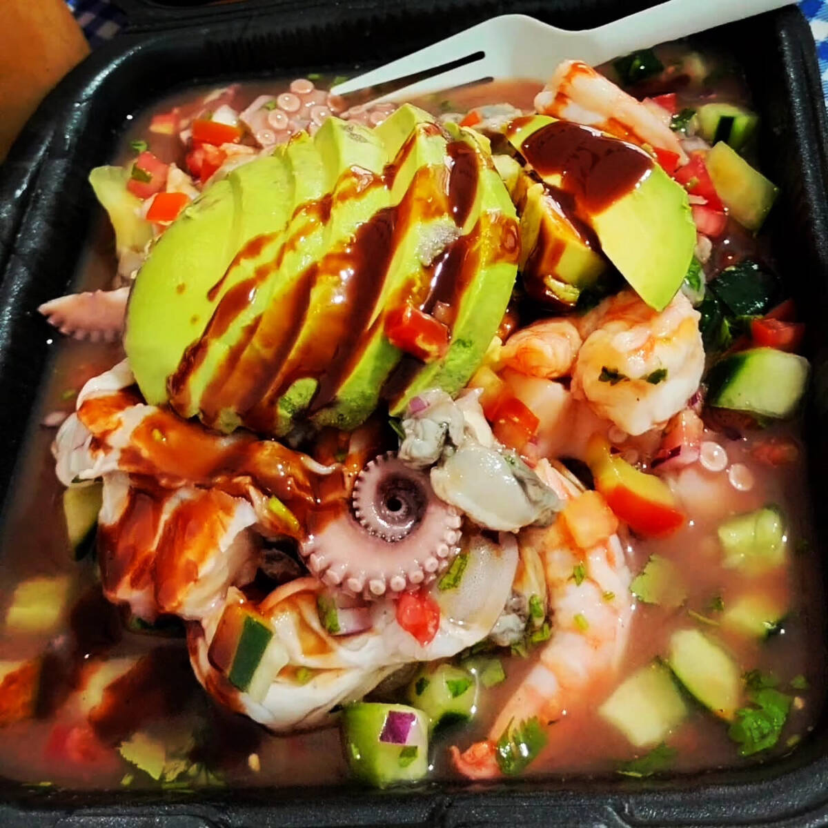 Ceviche campechano preparado al momento con camarón, pulpo, ostión y caracol, acompañado de verduras frescas, limón natural y salsas de la casa. Producto premium, bien servido y lleno de sabor.