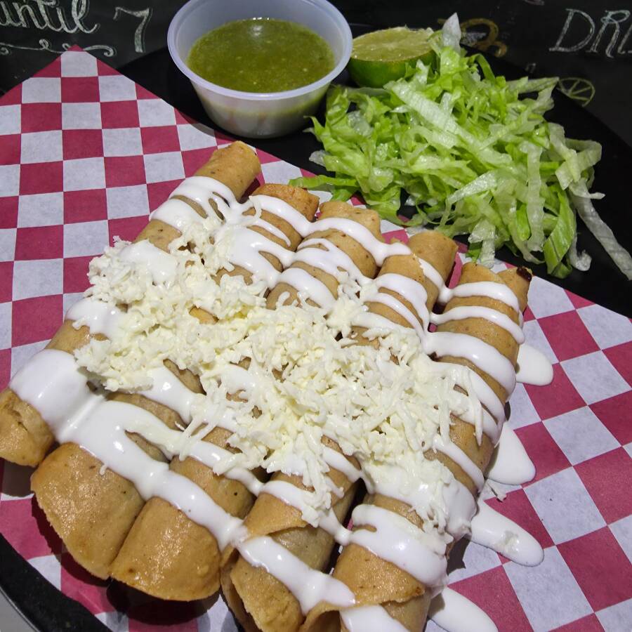DELICIOSOS TACOS DORADOS DE DESHEBARDA, CON CREMA, QUESO FRESCO, LECHUGA, SALSA PICANTE