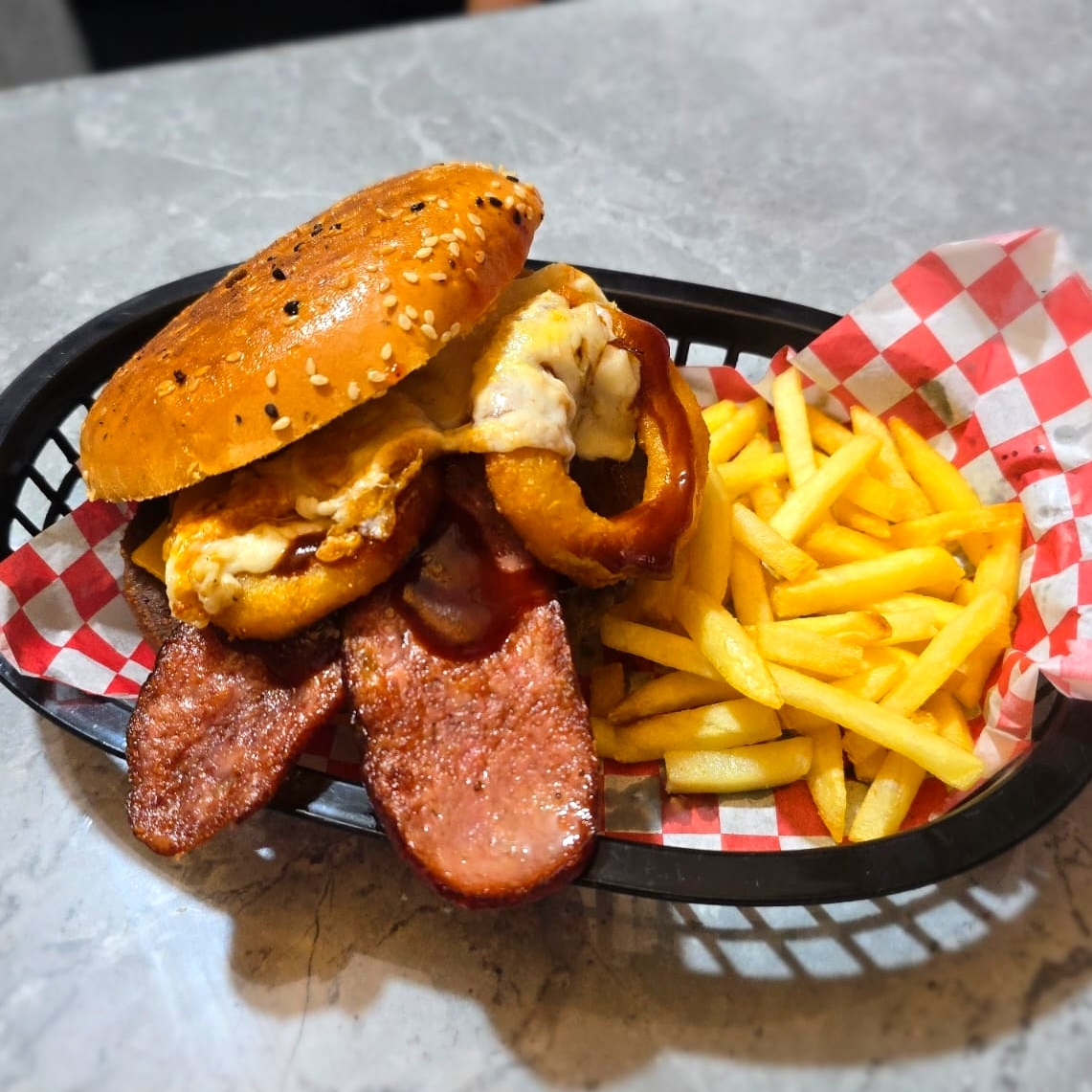 3 aros de cebolla, salsa bbq, tocino, carne de 150 gramos y papas