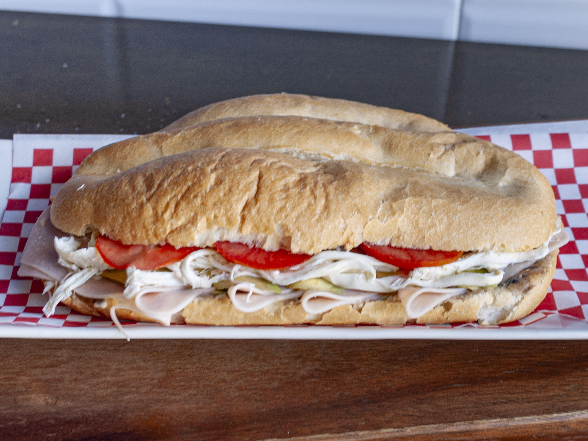Lechuga, jitomate, mayonesa, mostaza, jamon de pavo, queso crema, queso mozarella, queso manchego, aderezo chipotle, en pan multigrano.