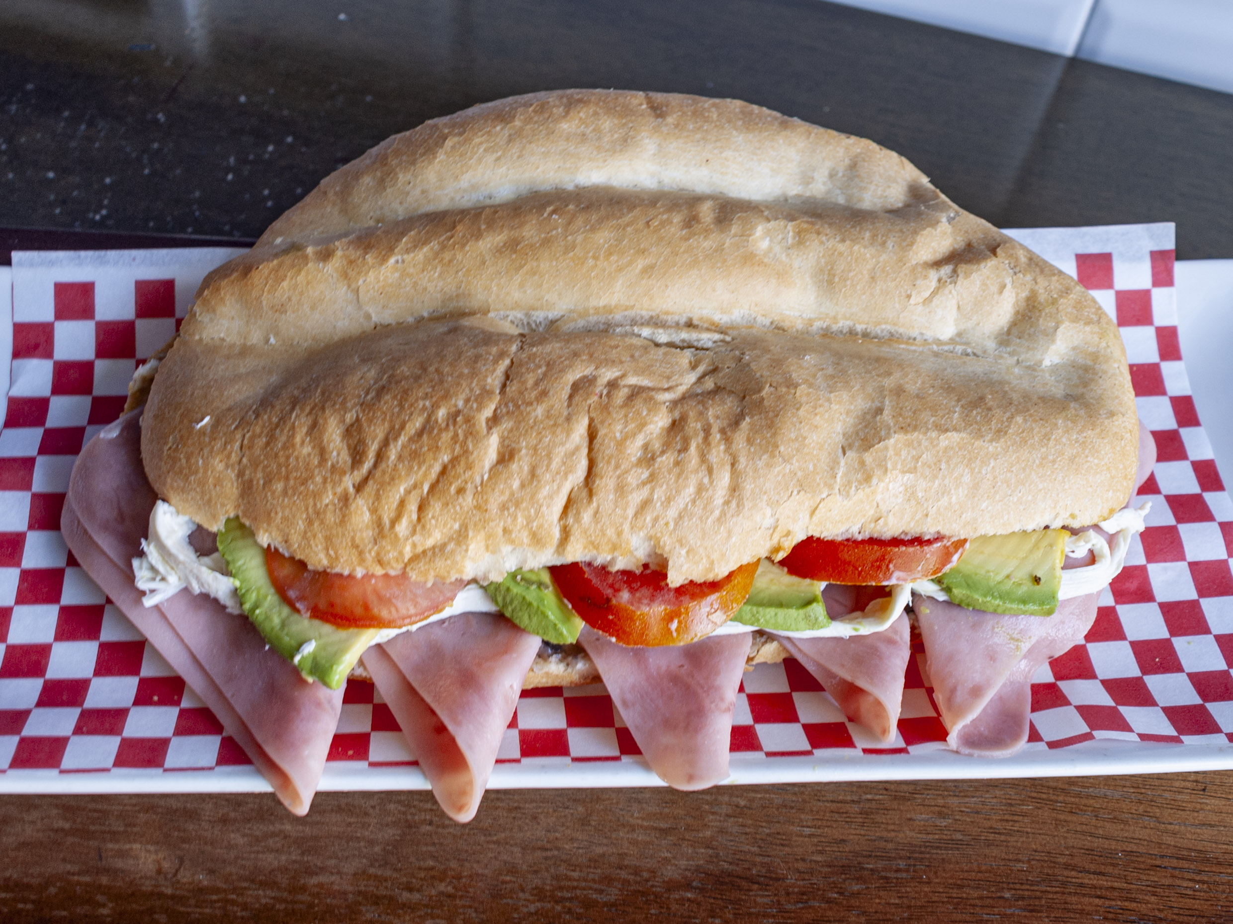Jamón serrano, queso crema, jitomate, aguacate, mayonesa, champiñones, queso mozzarella, aderezo mostaza miel, lechuga, con pan multigrano.