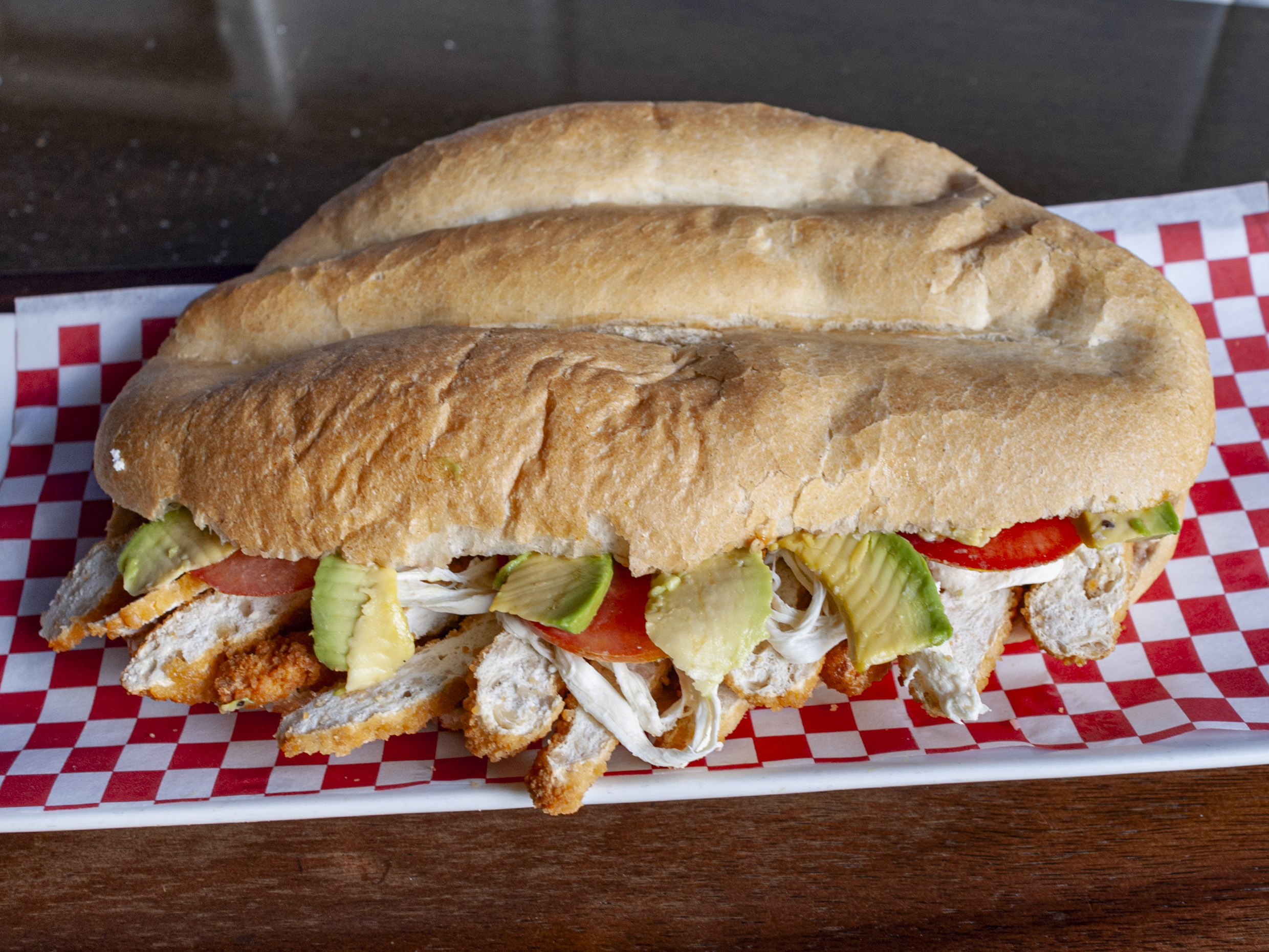 Pechuga de pollo deshebrado, queso panela, mayonesa, jitomate, cebolla morada, aguacate, lechuga, mostaza miel, aceite de olivo, en pan multigrano.