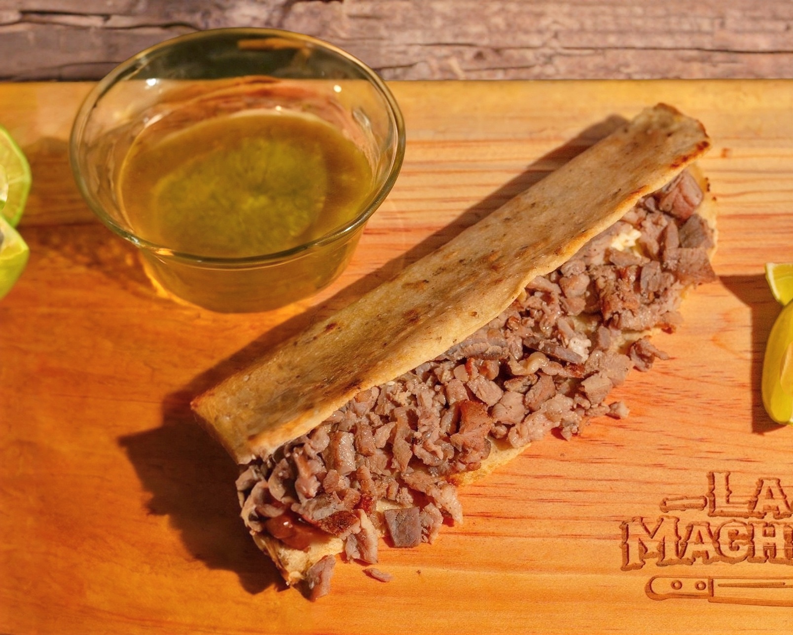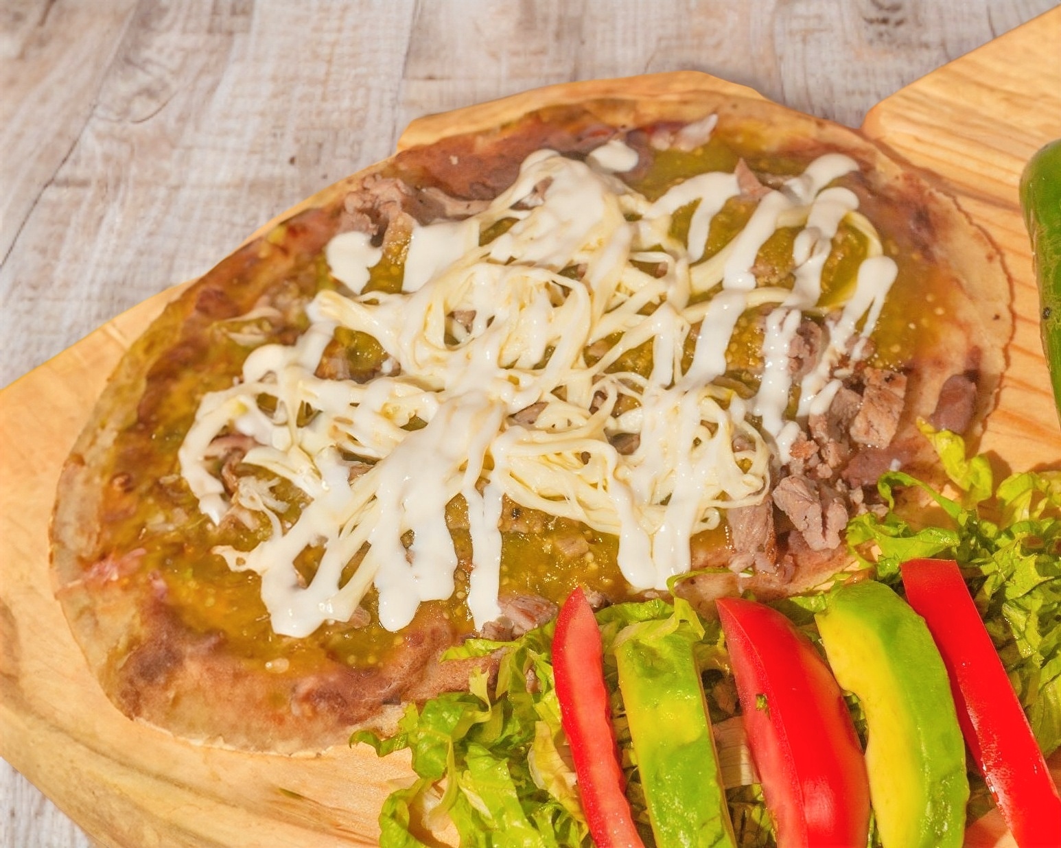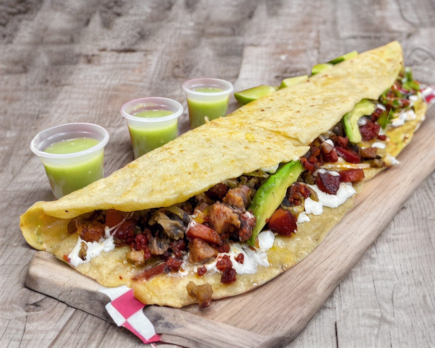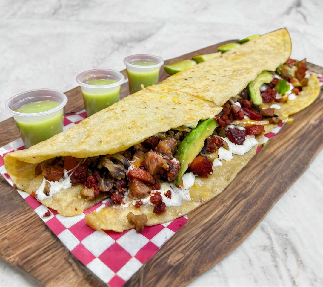 QUESADILLA EN FORMA DE MACHETE 35CM, 130g DE CARNE, QUESO, FRIJOLES, CREMA, AGUACATE.