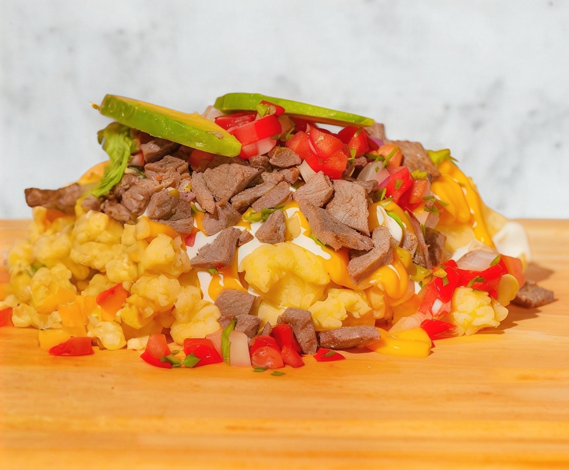 400g DE PURE DE PAPA, CARNE, CREMA, FRIJOLES, TOMATE, CEBOLLA, SALSA DE QUESO, AGUACATE, JALAPEÑ