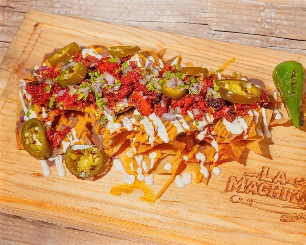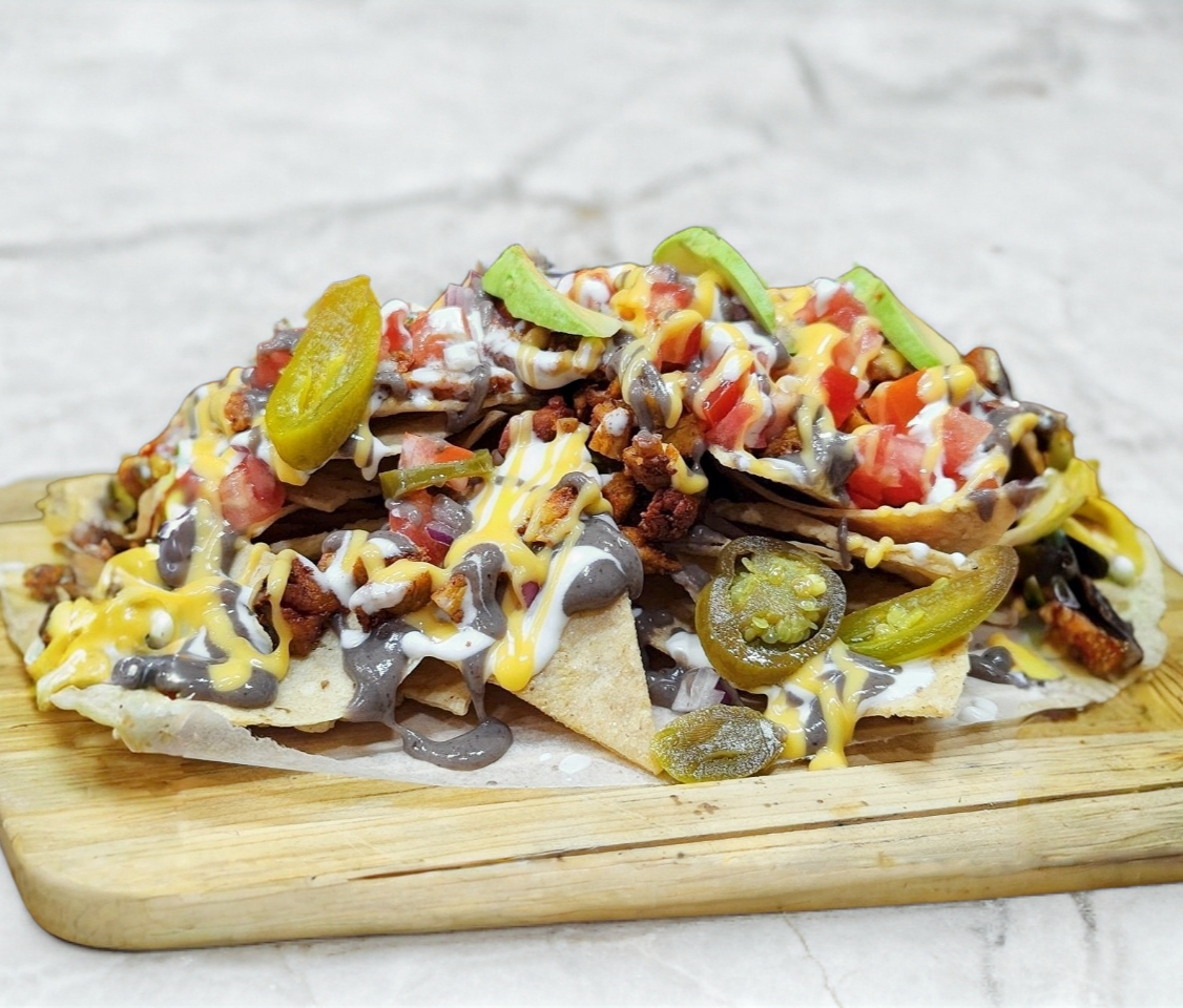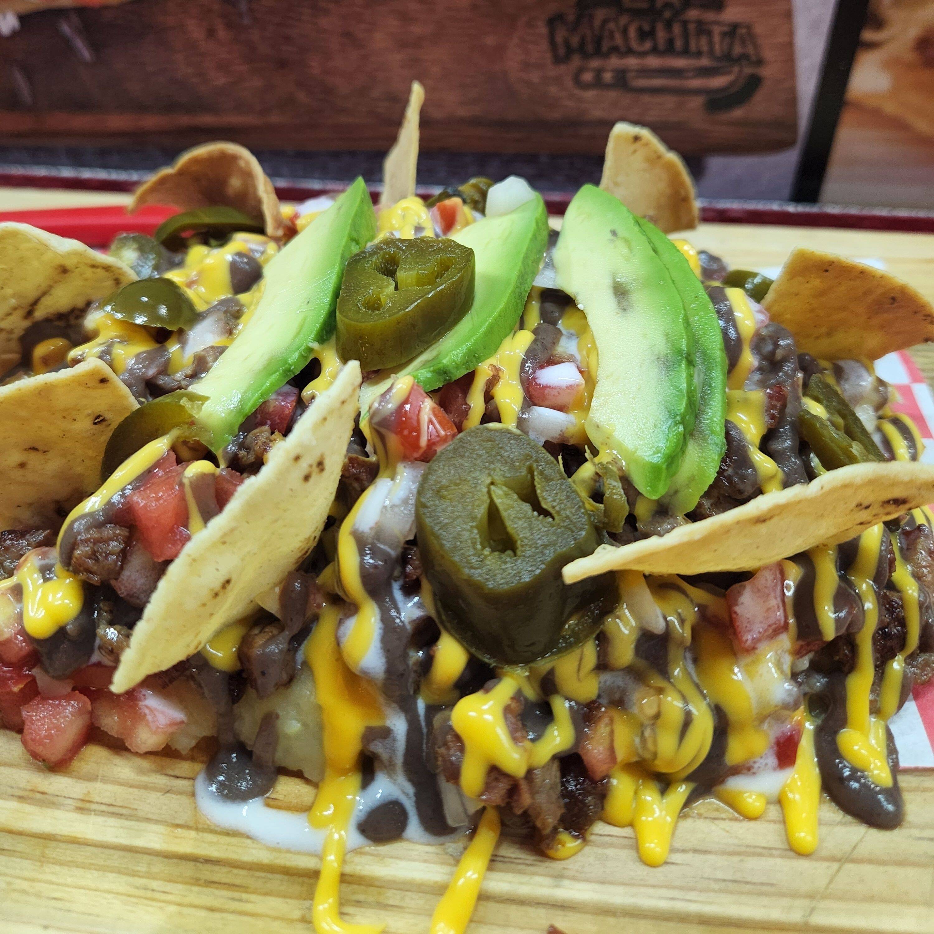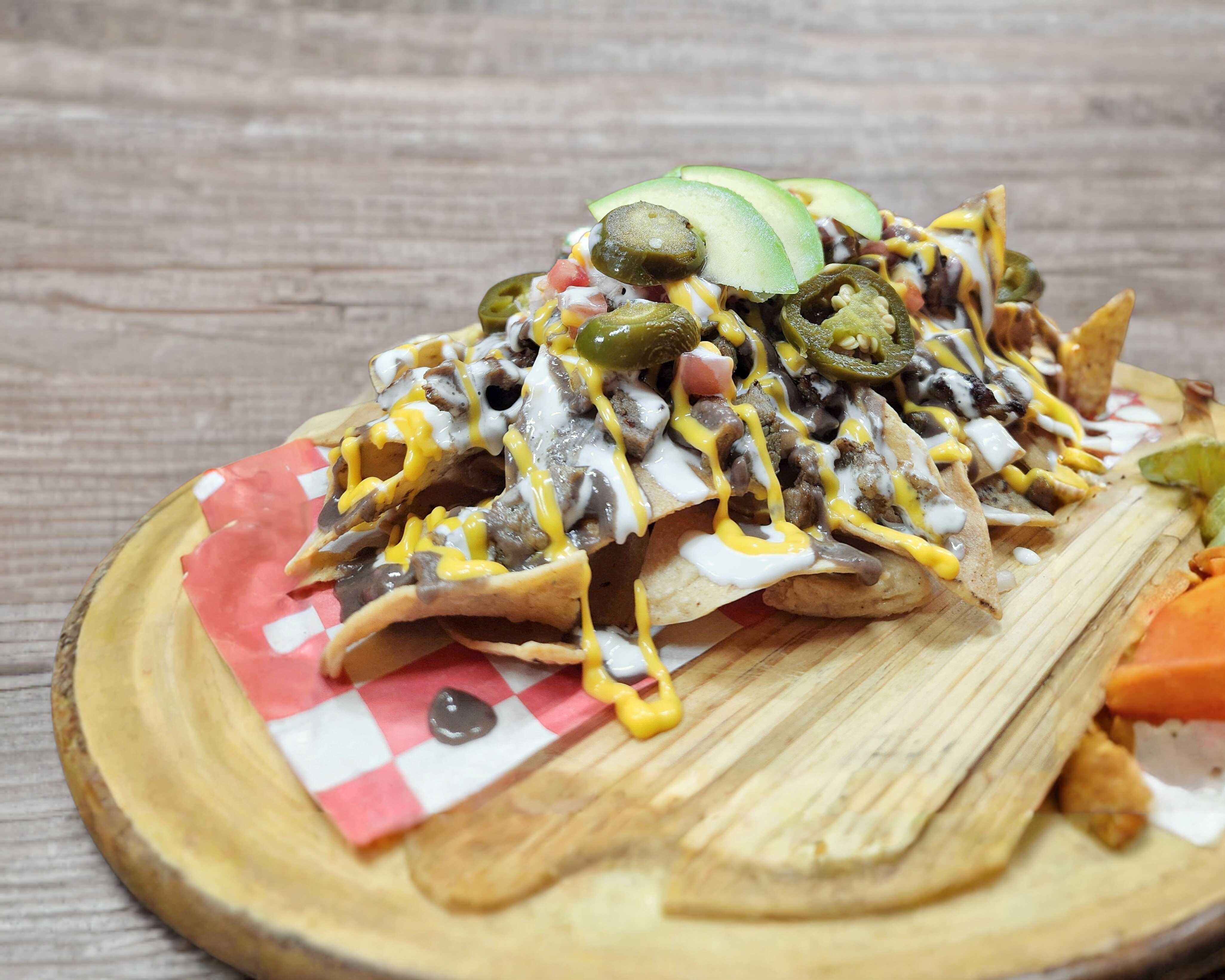 NACHOS CON TORTILLA DE TOTOPOS CON CARNE, SALSA DE QUESO,FRIJOLES, CREMA, TOMATE, CEBOLLA,AGUACATE, JALAPEÑOS