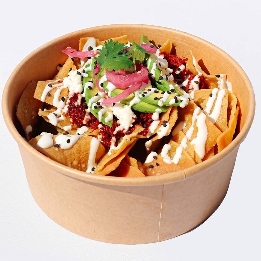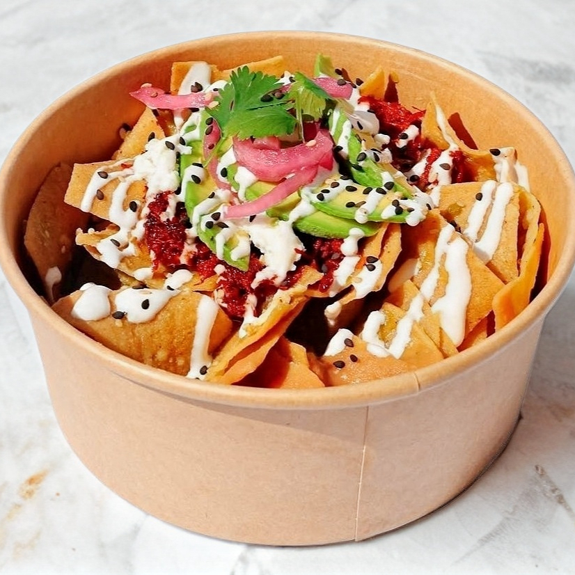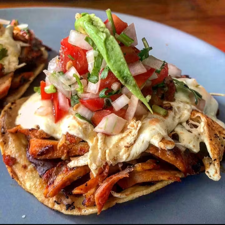 Tortilla tostata, frijol, proteína, queso manchego, pico de gallo, aguacate y aderezo de chipotle