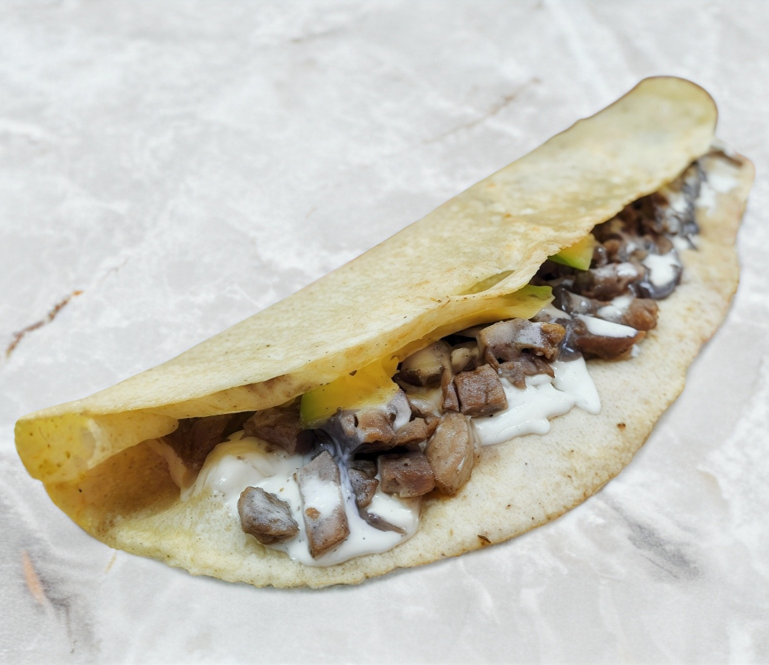 TORTILLA DE MAIZ A LA PLANCHA, COL, CREMA, FRIJOLES, QUESO, PROTEINA