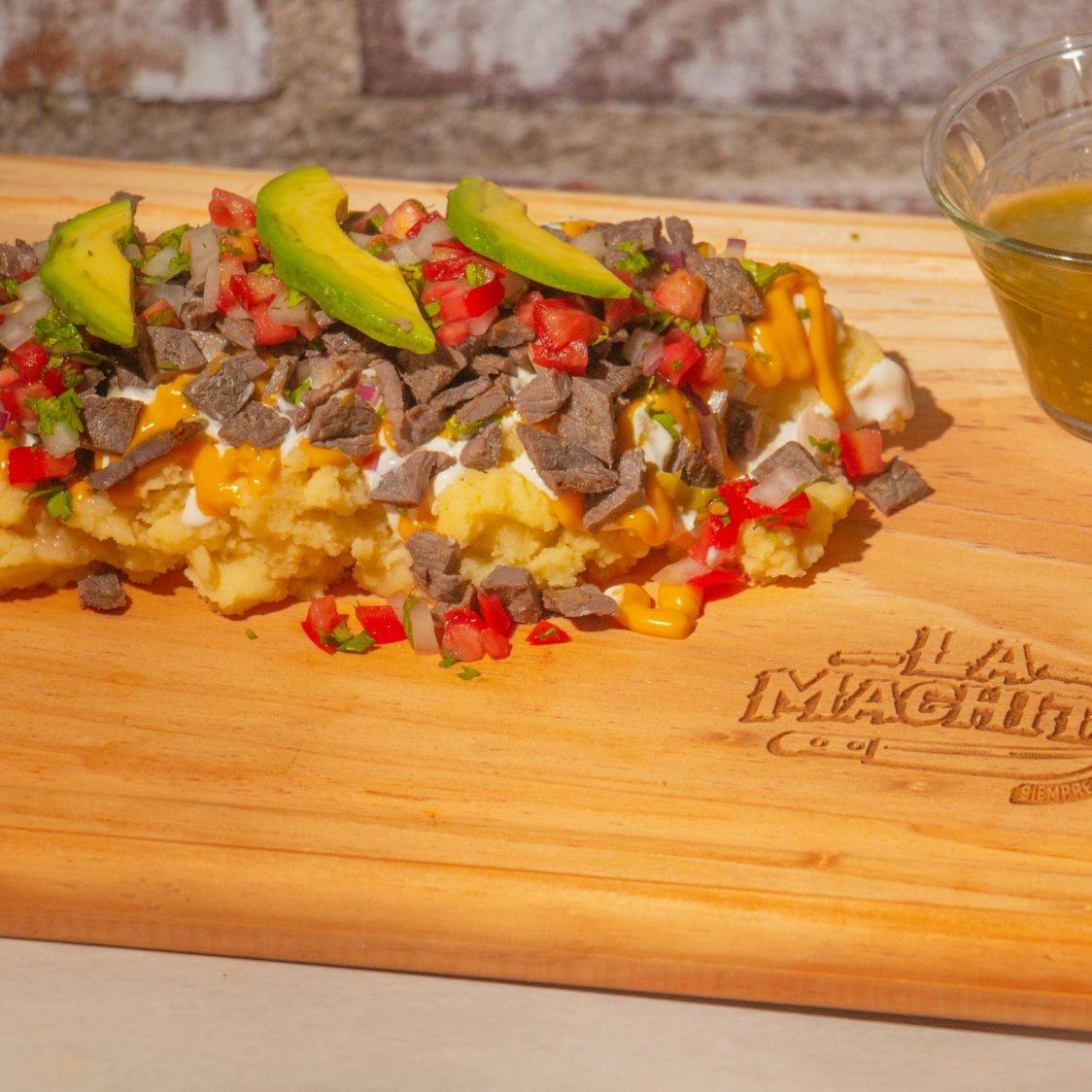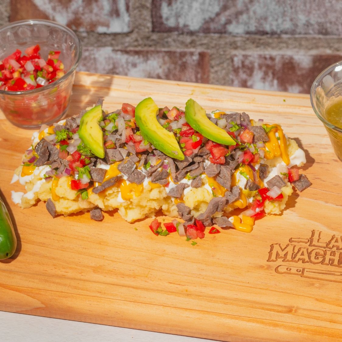 400g DE PURE DE PAPA, CARNE, CREMA, FRIJOLES, TOMATE, CEBOLLA, SALSA DE QUESO, AGUACATE, JALAPEÑO Y TOTOPOS