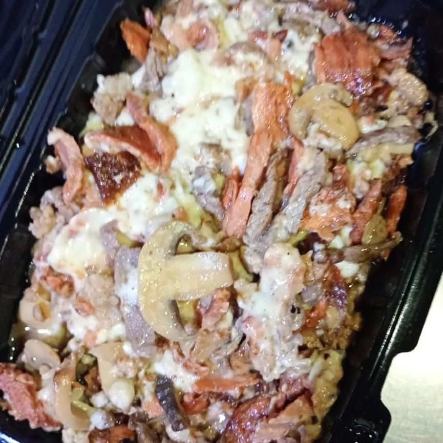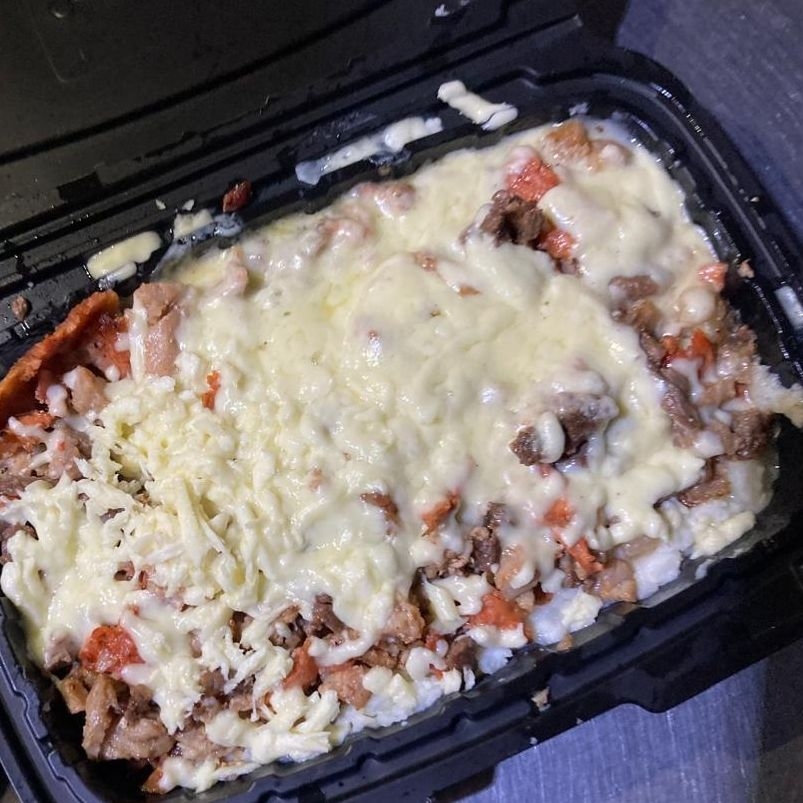 Carne de top sirloin, capa de aguacate, jamón y queso gratinado.