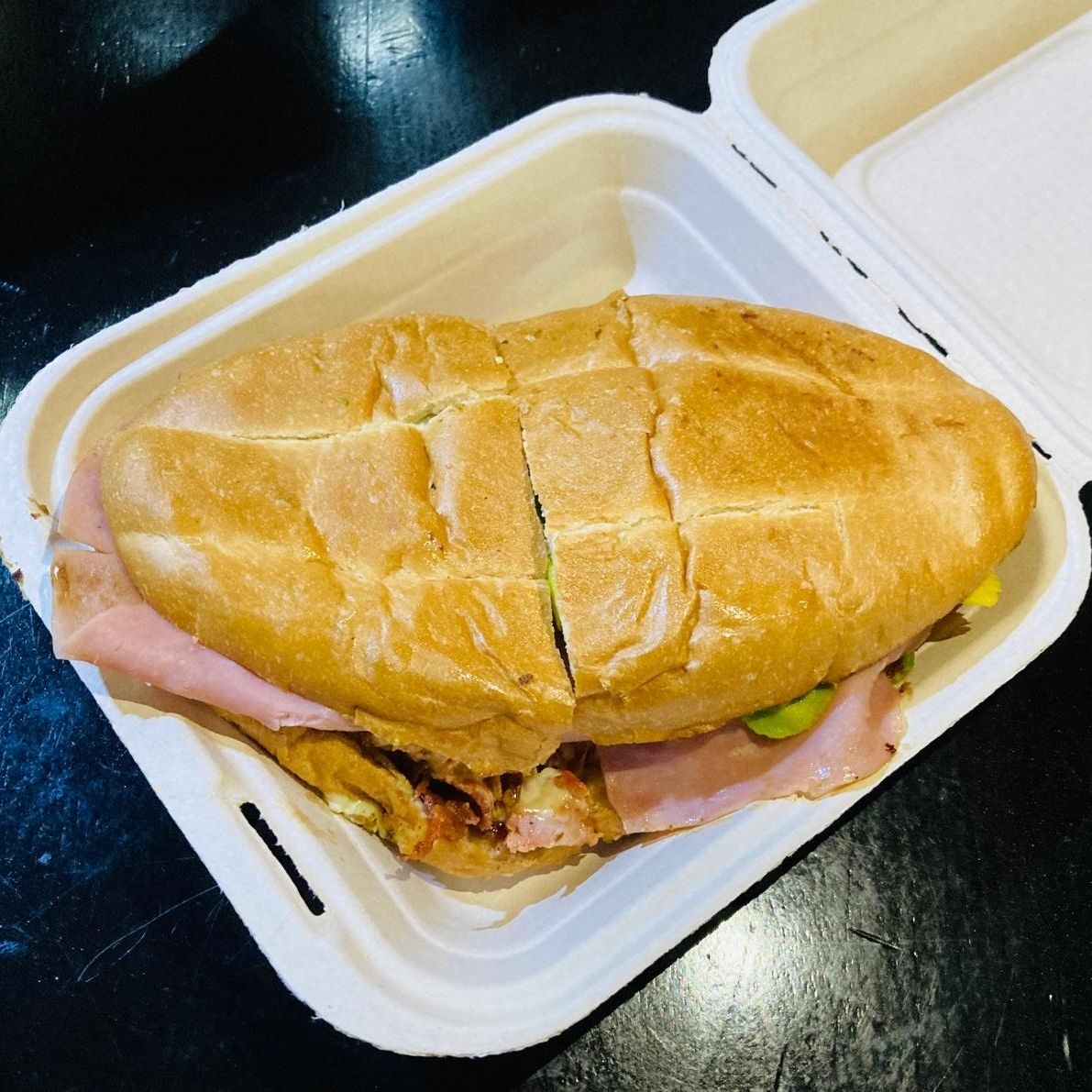 Carne de bisteck, jamón y una capa de aguacate.
