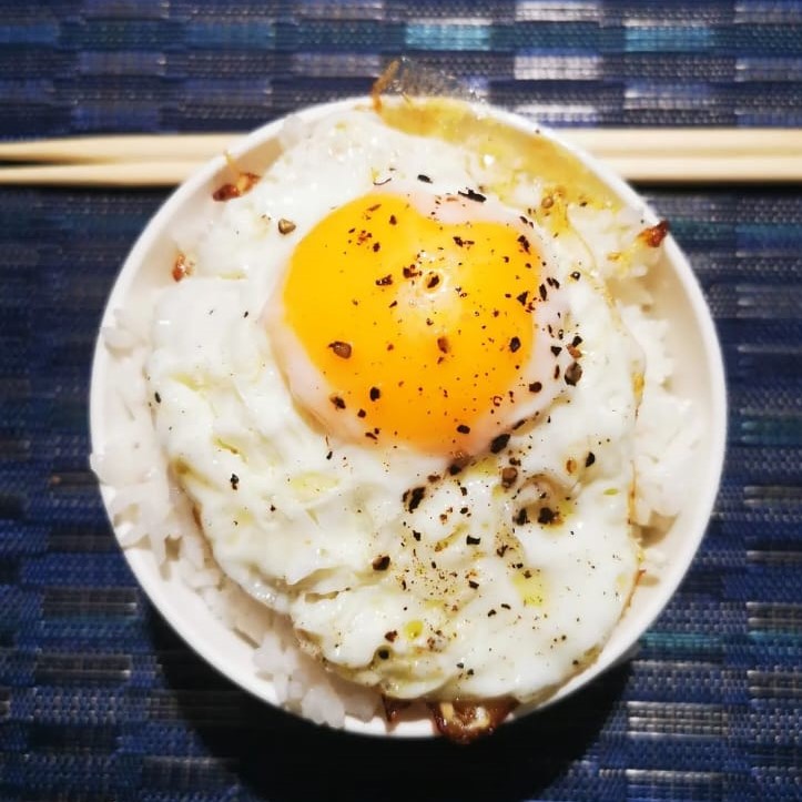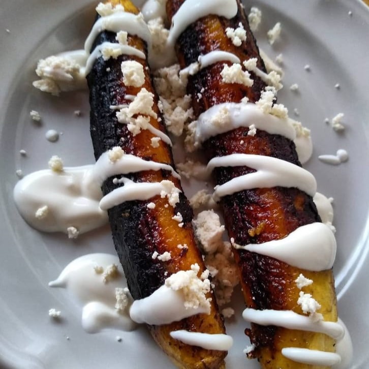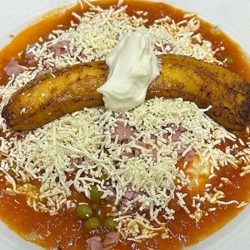 2 Huevos estrellados sobre una cama de arroz, bañados en mole artesanal con platanitos.