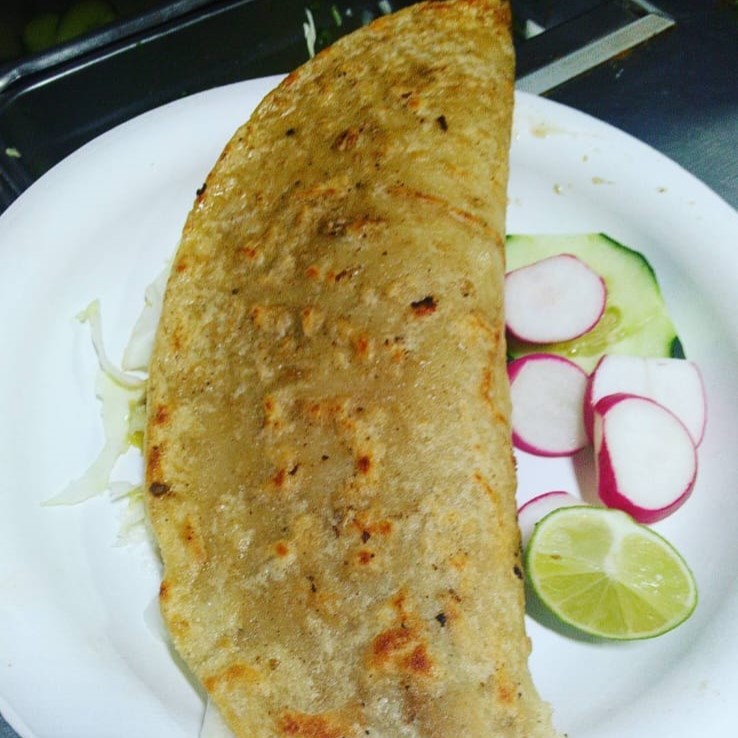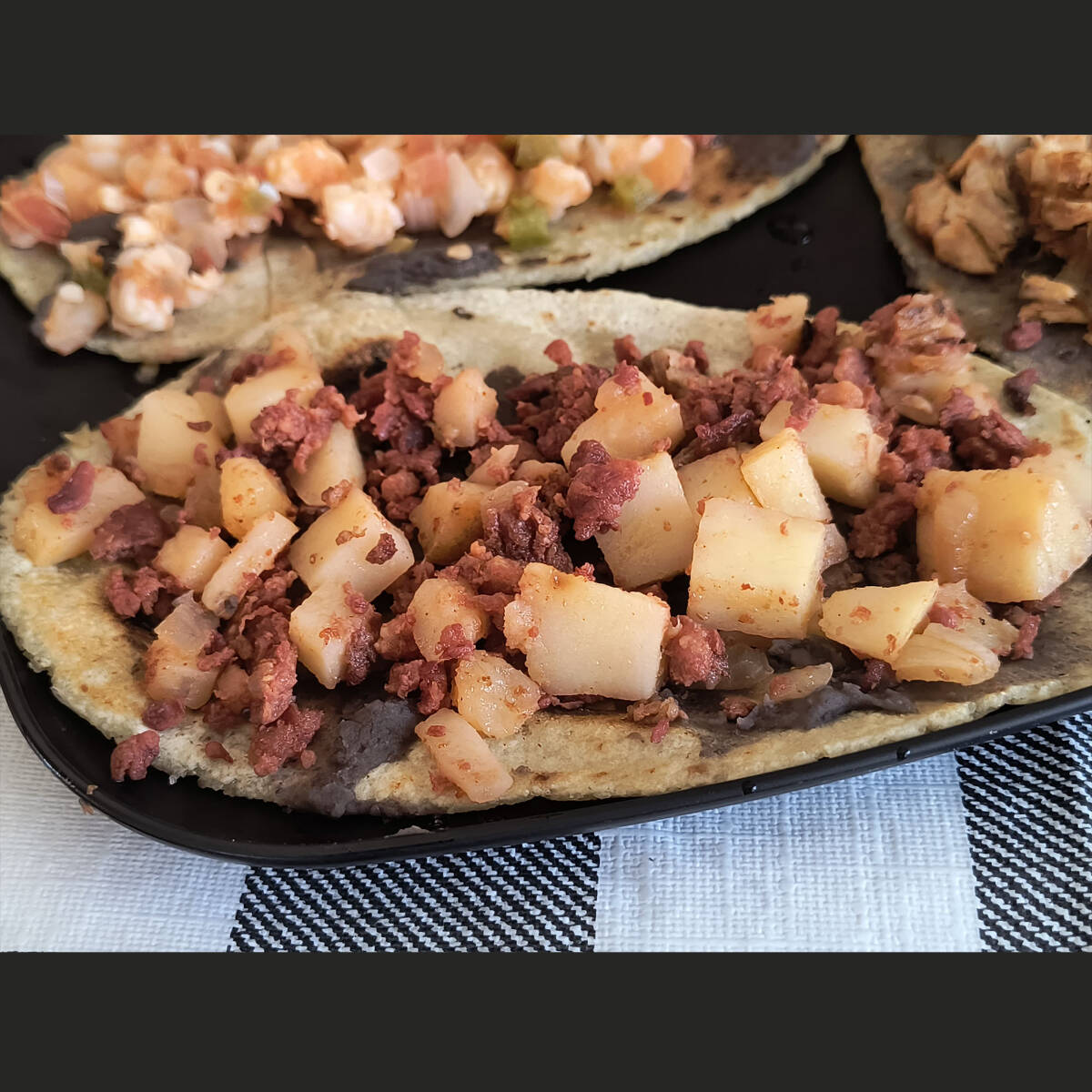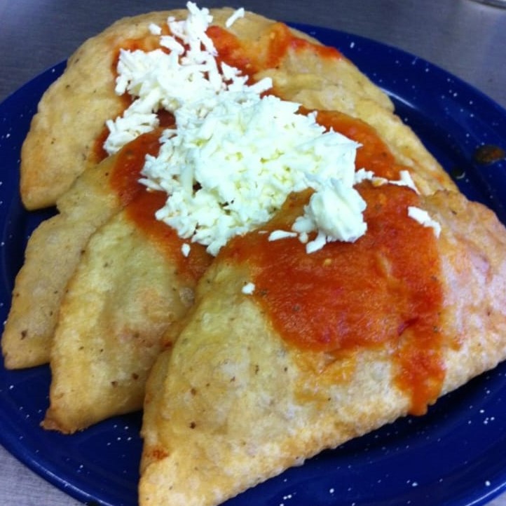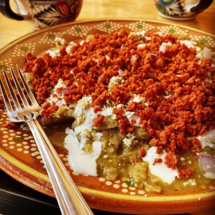 Rellenas de pollo o huevo, cubiertas de chorizo, aguacate y crema.