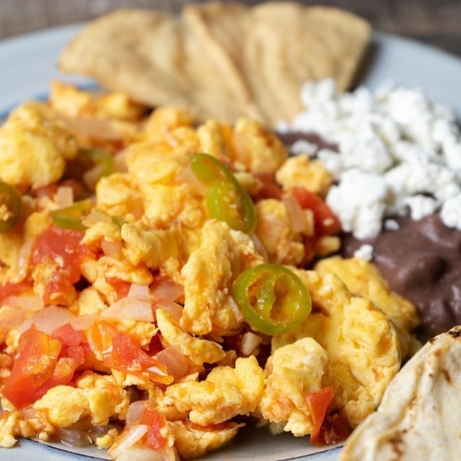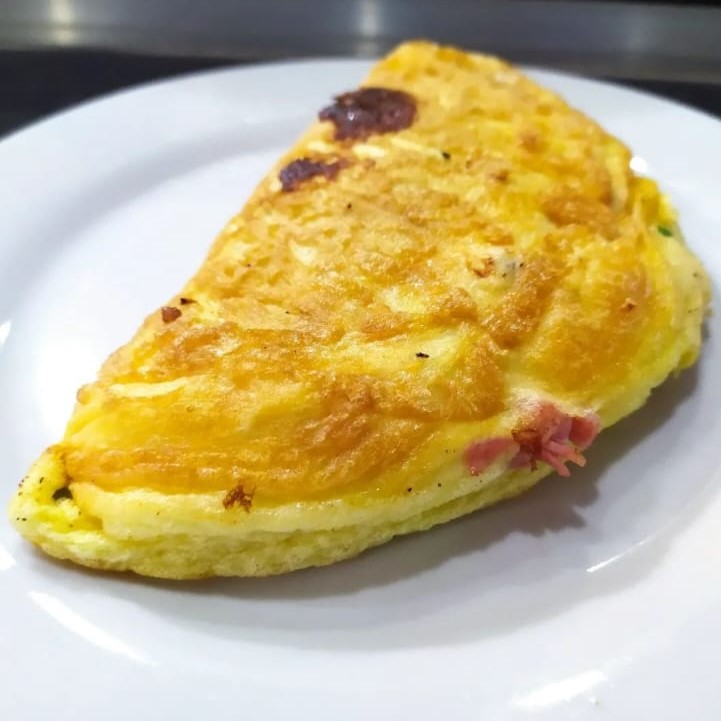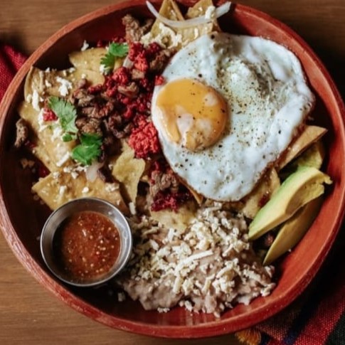 Con chorizo o jamón, acompañado de chilaquiles y pico de gallo.