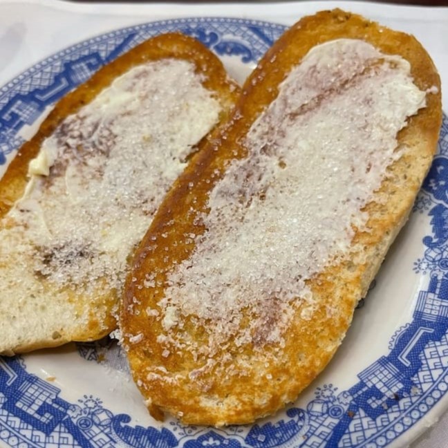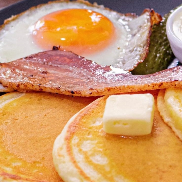 2 Huevos estrellados, 2 hot cakes, tocino frito y pan tostado.