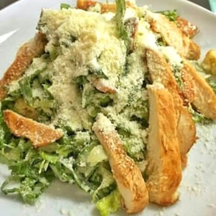 Mix de lechugas, crotones, pollo en tiras a la parrilla y queso parmesano con aderezo.