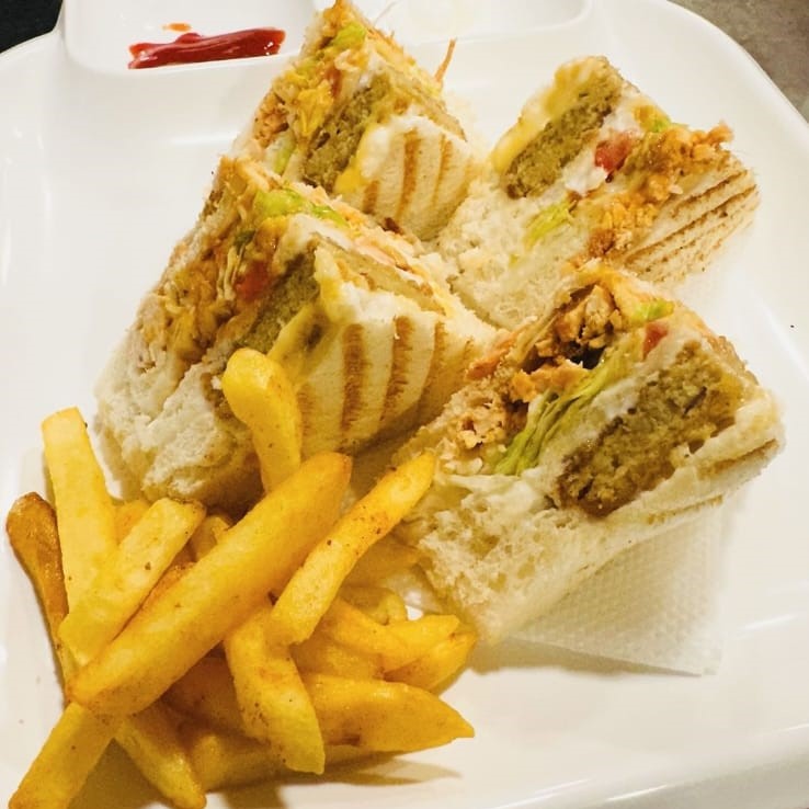 Mix de lechugas, tomate, pepino, crotones, zanahoria rallada, milanesa empanizada y panela.