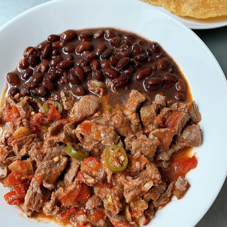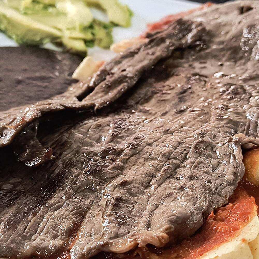 2 Huevitos estrellados con bistec asado y chilaquiles rojos.