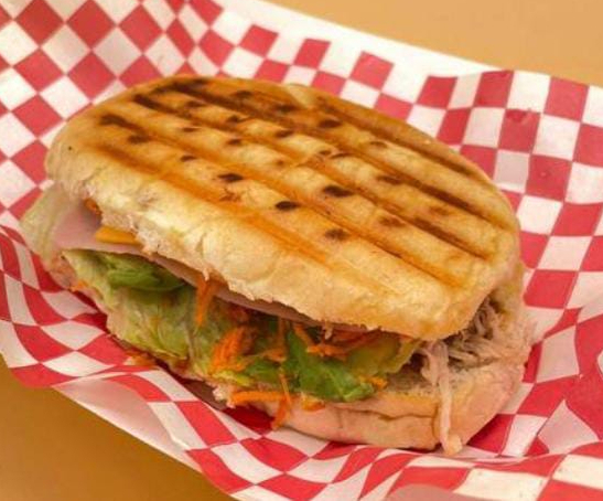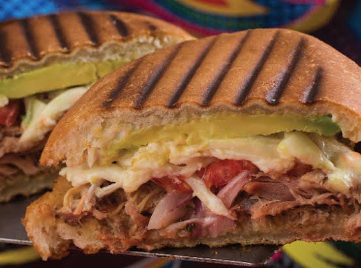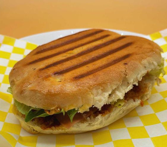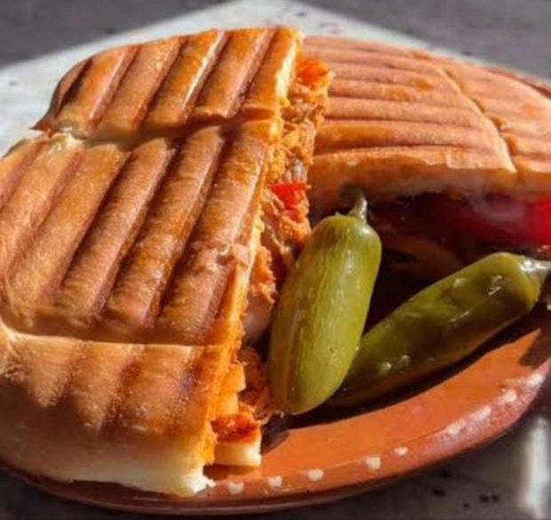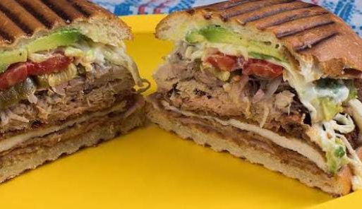 Torta grande rellena de pierna horneada, arrachera de res, queso americano y BBQ.